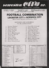 Match: Leicester City Reserves v Norwich City Reserves Competition: Football Combination Date: 23-01-1982 Comments: Single sheet Rating: 4 Condition: Light creases Weight in grams: 20