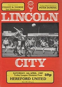 Match: Lincoln City v Hereford United Competition: League Division 4 Date: 04-04-1987 Comments: Rating: 4 Condition: Very good Weight in grams: 80