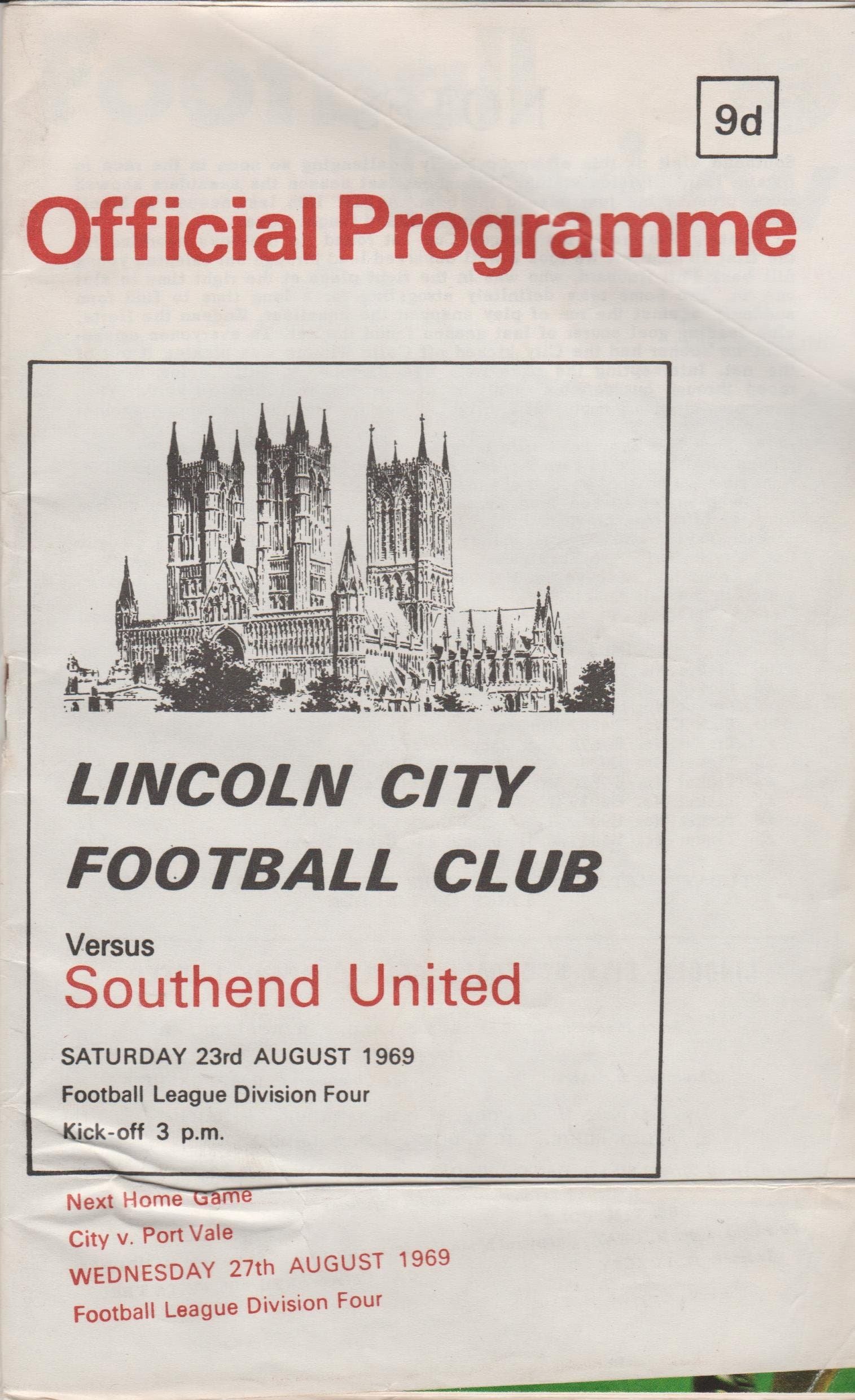 Match: Lincoln City v Southend United Competition: League Division 4 Date: 23-Aug-1969 Comments: Rating: 3 Condition: Creasing on cover Weight in grams: 60