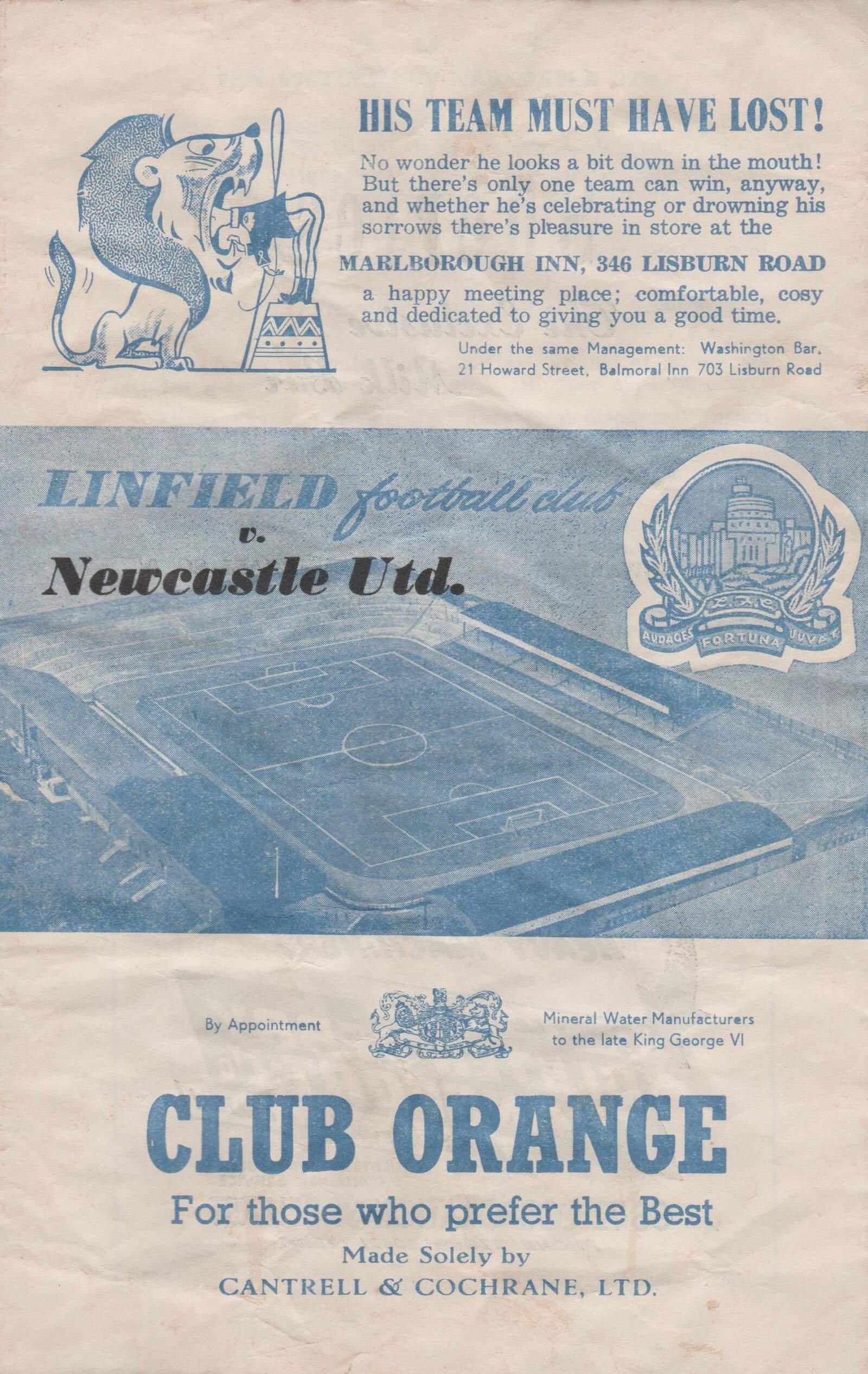 Match: Linfield v Newcastle United Competition: Friendly Date: 1958-59 Comments: Rating: 3 Condition: Creased Weight in grams: 60