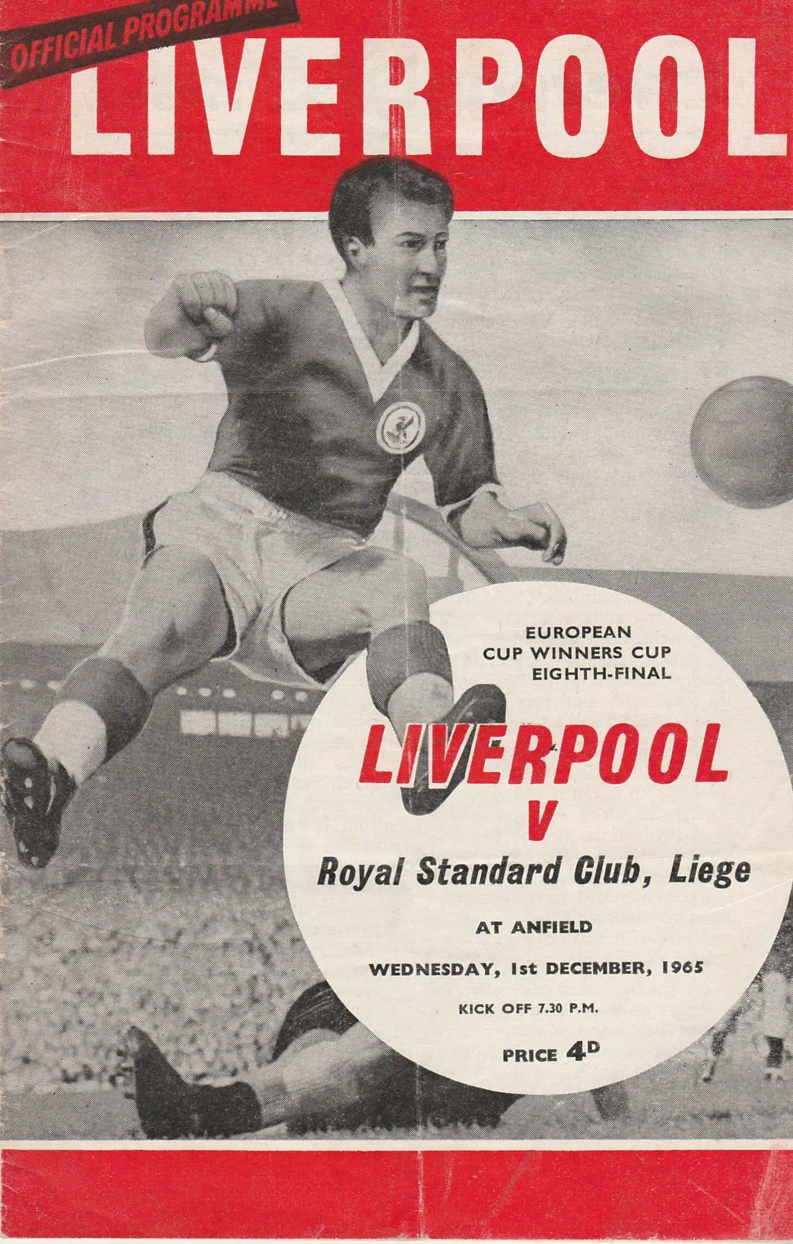 Match: Liverpool v Standard Liege Competition: European Cup Winners Cup 1st Round 1st leg Date: 01-Dec-1965 Comments: Rating: 3 Condition: Fold, light creases