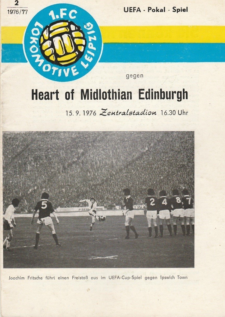 Match: Lokomotive Leipzig v Heart of Midlothian Competition: European Cup Winners Cup 1st Round 1st leg Date: 15-Sep-1976 Comments: Rating: 4 Condition: Very good, small area of print loss of back page Weight in grams: 60