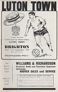 Match: Luton Town v Brighton and Hove Albion Competition: League Cup 2nd Round Replay Date: 11-09-1968 Comments: Rating: 4 Condition: Very good Weight in grams: 40