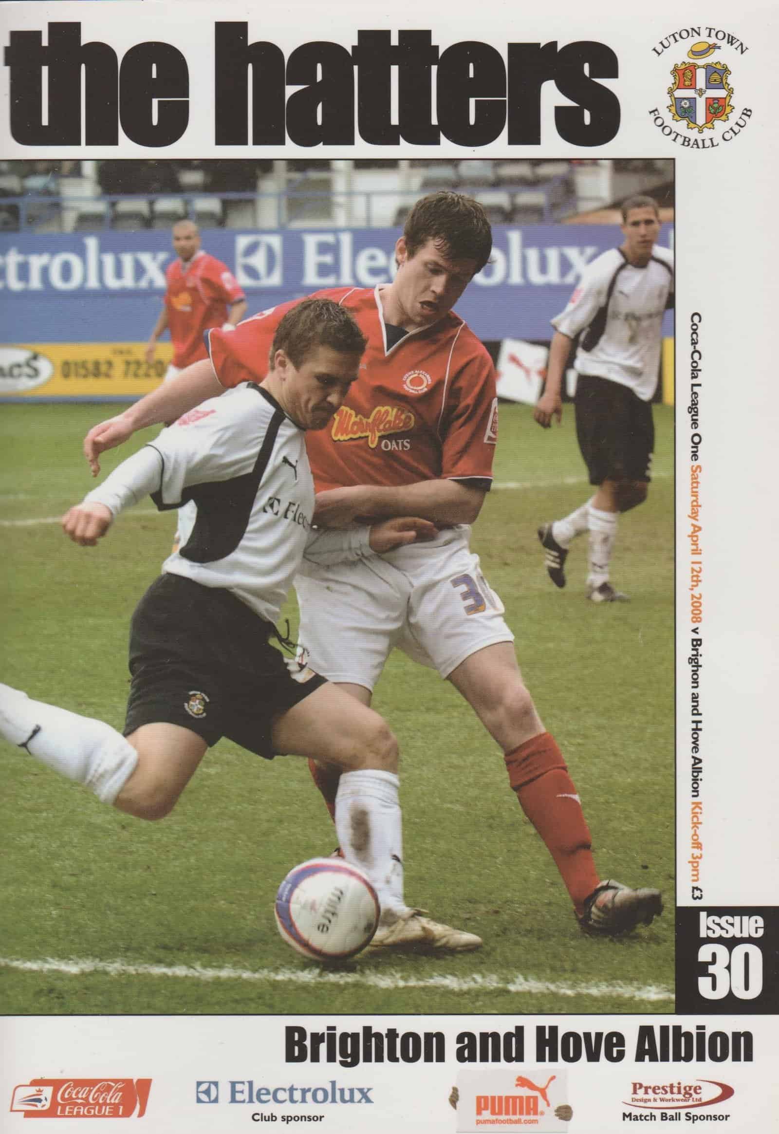 Match: Luton Town v Brighton and Hove Albion Competition: Coca Cola League 1 Date: 12-Apr-2008 Comments: Rating: 4 Condition: Very good Weight in grams: 160