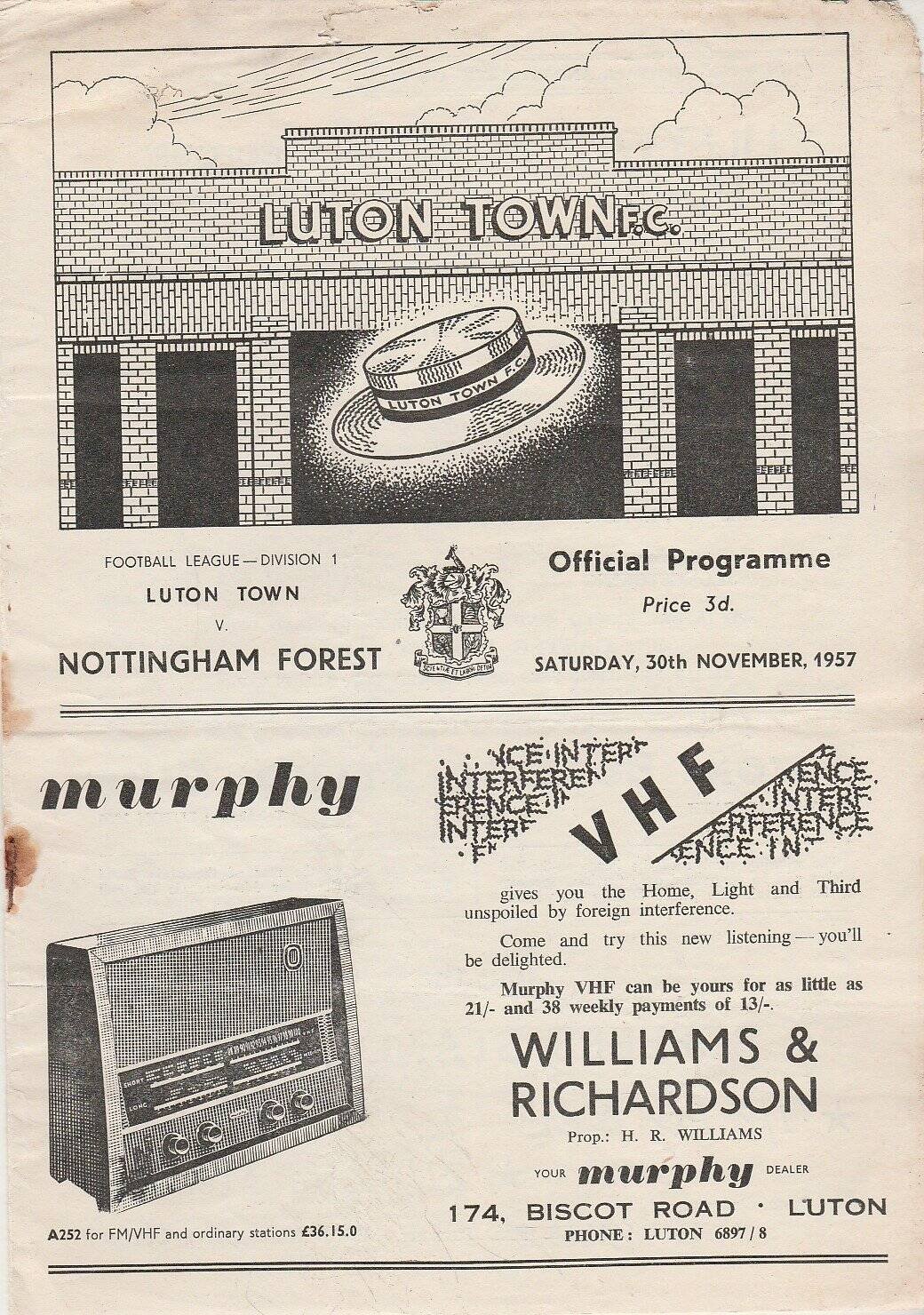 Match: Luton Town v Nottingham Forest Competition: League Division 1 Date: 30-Nov-1957 Comments: Rating: 3 Condition: Rusty staple, rust bleed, paper loss on corner, fold/tear on top edge of cover Weight in grams: 80