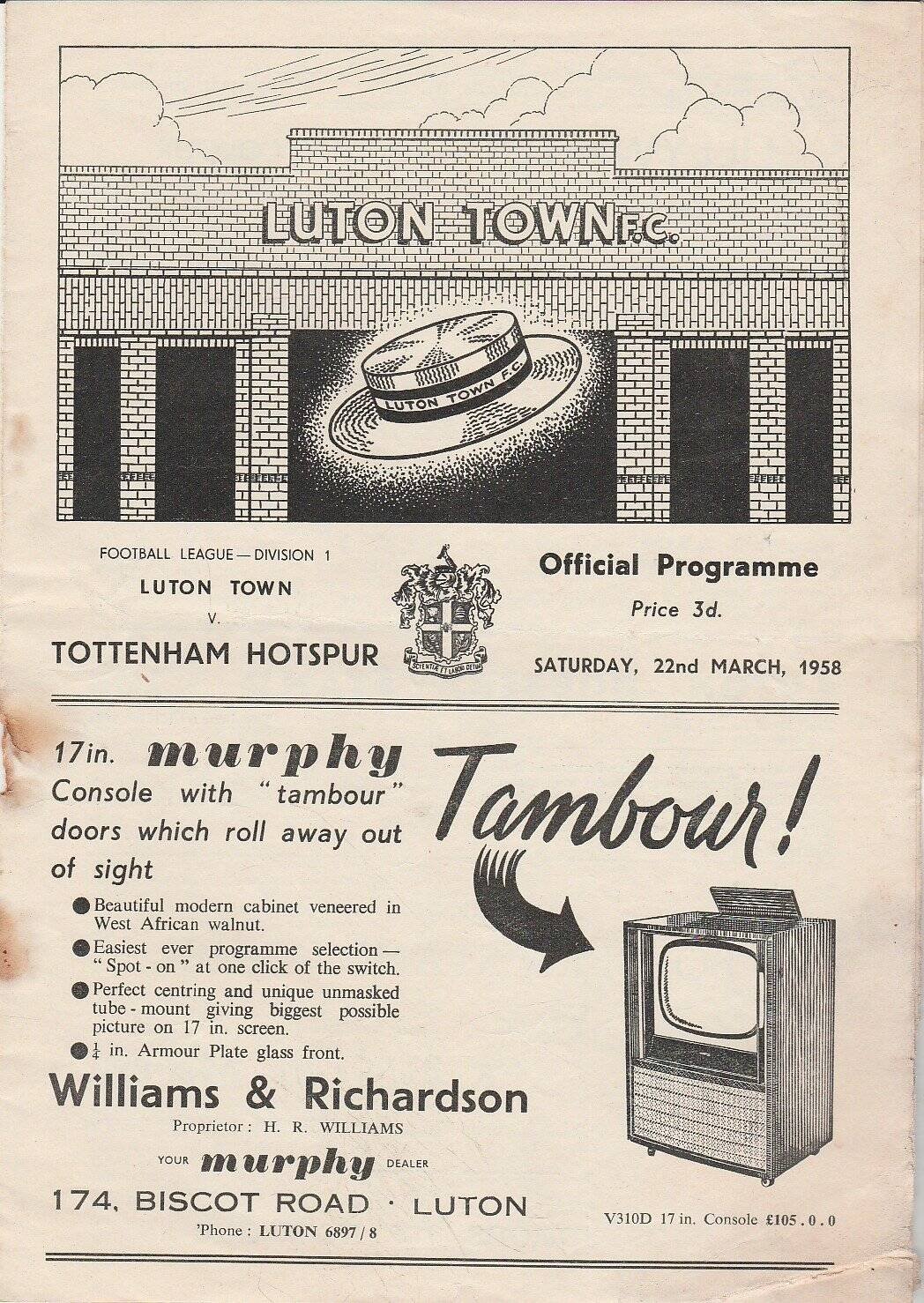 Match: Luton Town v Tottenham Hotspur Competition: League Division 1 Date: 22-Mar-1958 Comments: Rating: 3 Condition: Staple removed, rust bleed, tear on corner of cover, paper loss on corner of back page Weight in grams: 60