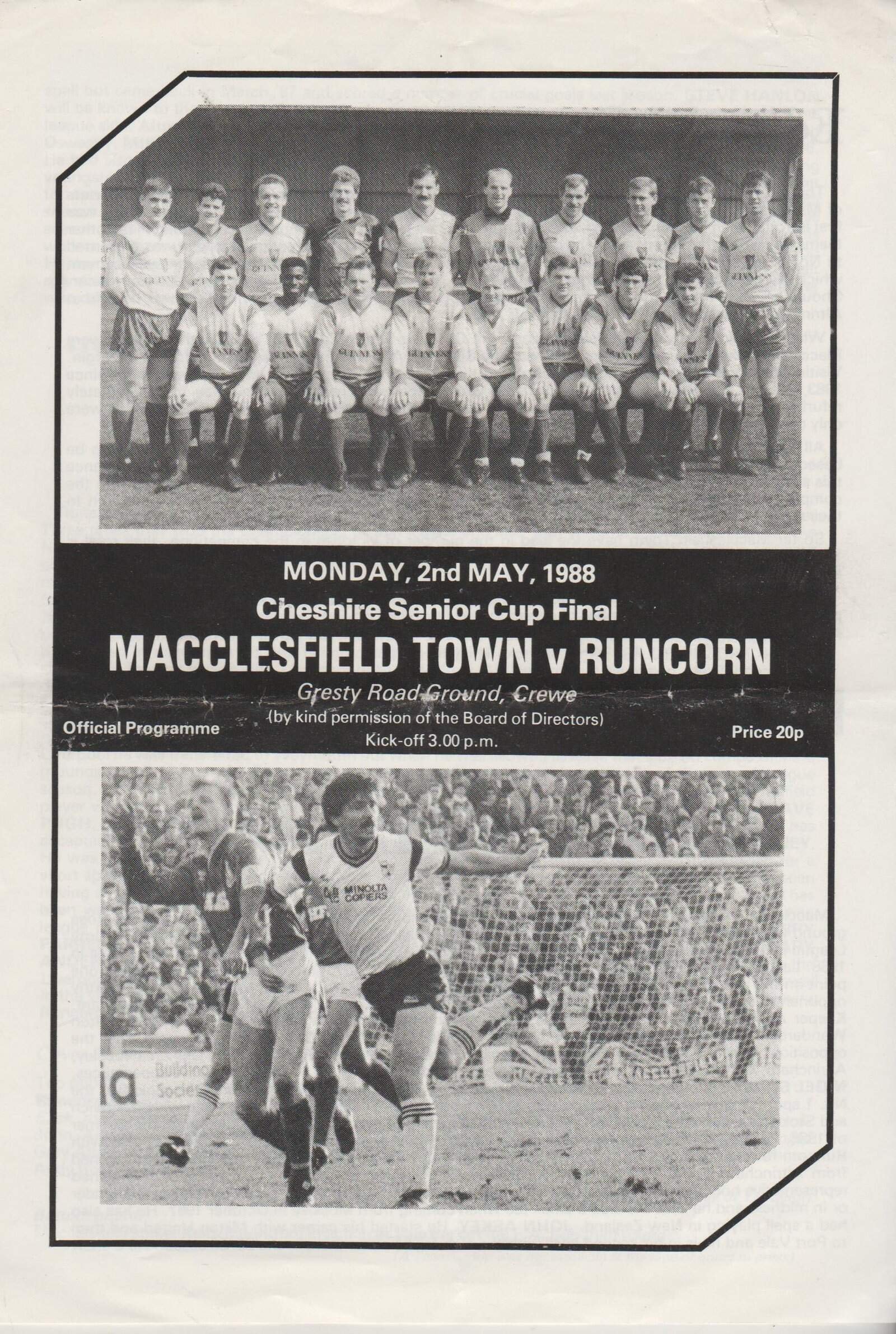 Match: Macclesfield Town v Runcorn Competition: Cheshire Senior Cup Final Date: 02-May-1988 Comments: Played at Crewe Alexandra FC Rating: 3 Condition: Folds Weight in grams: 40