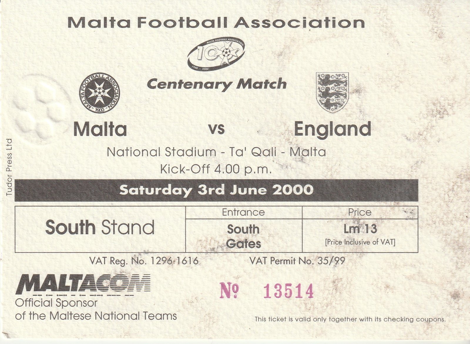 Match: Malta v England Competition: International Friendly Date: 03-Jun-2000 Comments: Rating: 4 Condition: Light soiling marks Weight in grams: 20