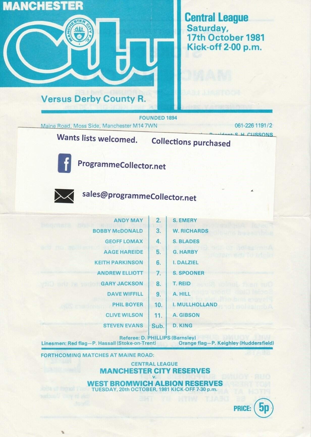 Match: Manchester City Reserves v Derby County Reserves Competition: Central League Date: 17-Oct-1981 Comments: Single sheet Rating: 3 Condition: Fold, small nick on edge Weight in grams: 20