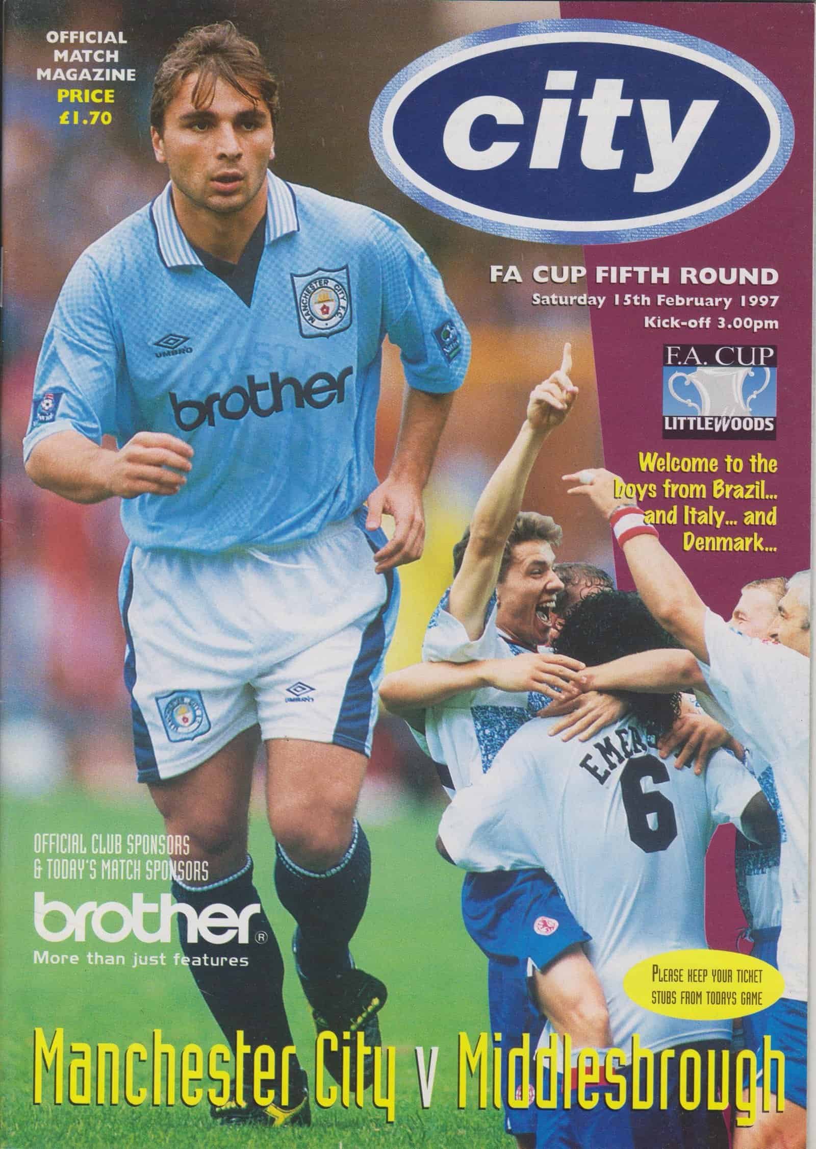 Match: Manchester City v Middlesbrough Competition: FA Cup 5th Round Date: 20-Dec-1997 Comments: Rating: 4 Condition: Very good Weight in grams: 100