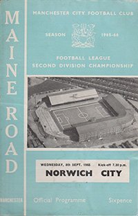 Match: Manchester City v Norwich City Competition: League Division 2 Date: 08-09-1965 Comments: Postponed issue Rating: 3 Condition: Water stains Weight in grams: 40