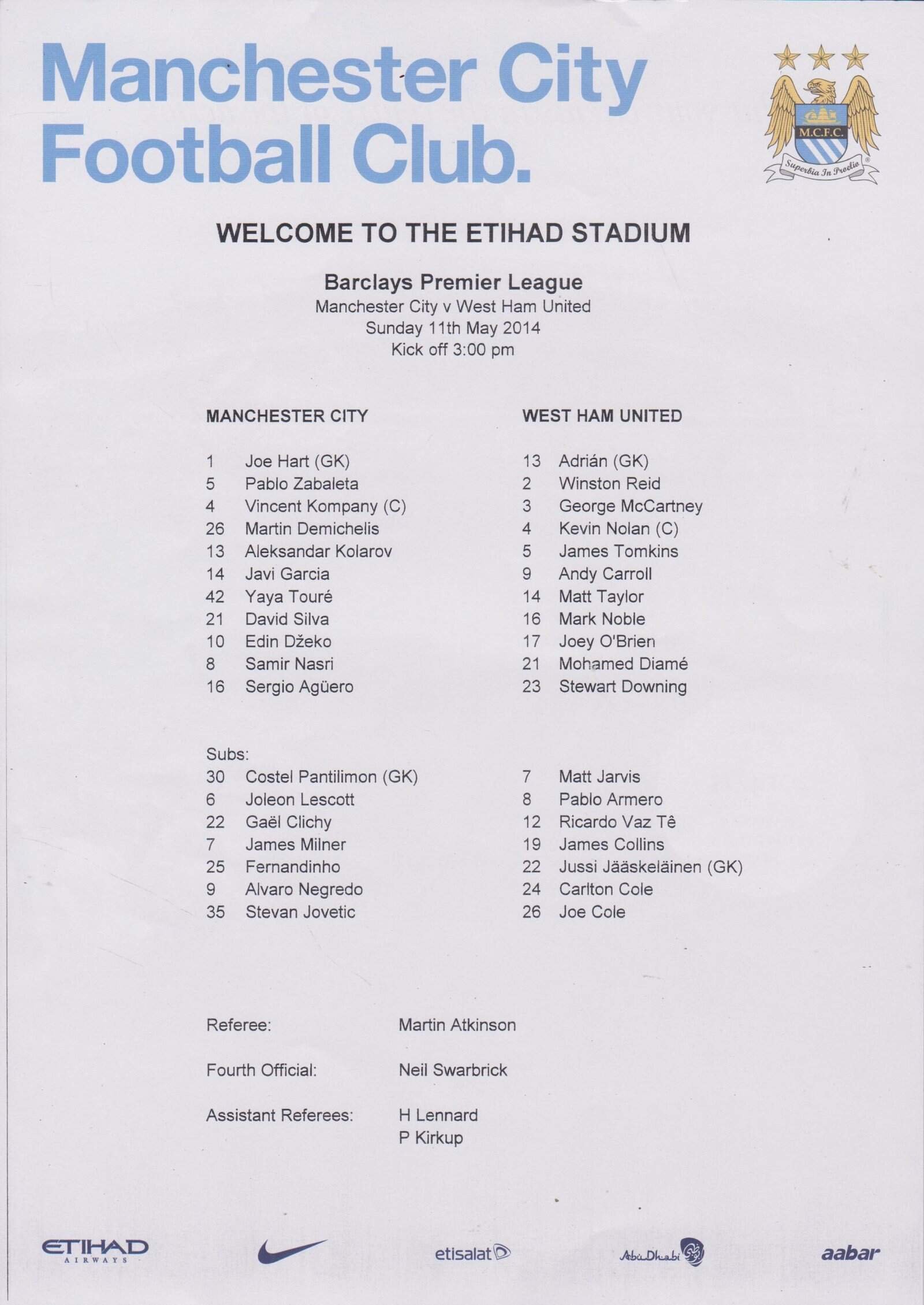 Manchester City v West Ham United 11-May-2014