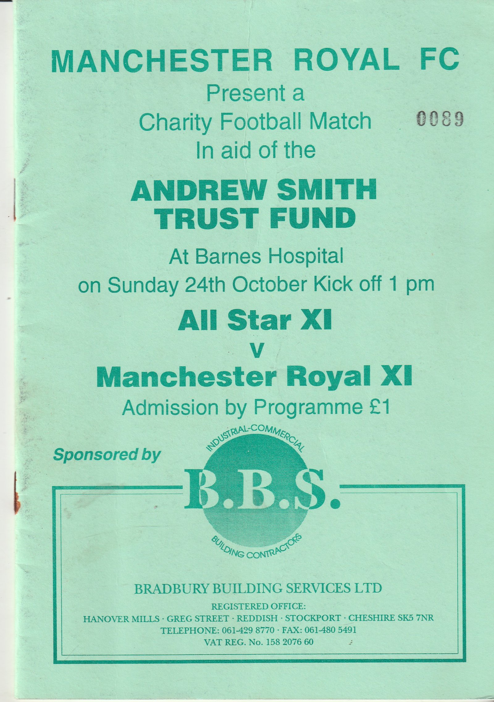 Match: Manchester Royal XI v All Star XI Competition: Friendly Date: 24-Oct-???? Comments: Andrew Smith Trust match Rating: 3 Condition: Rusty staple Weight in grams: 120