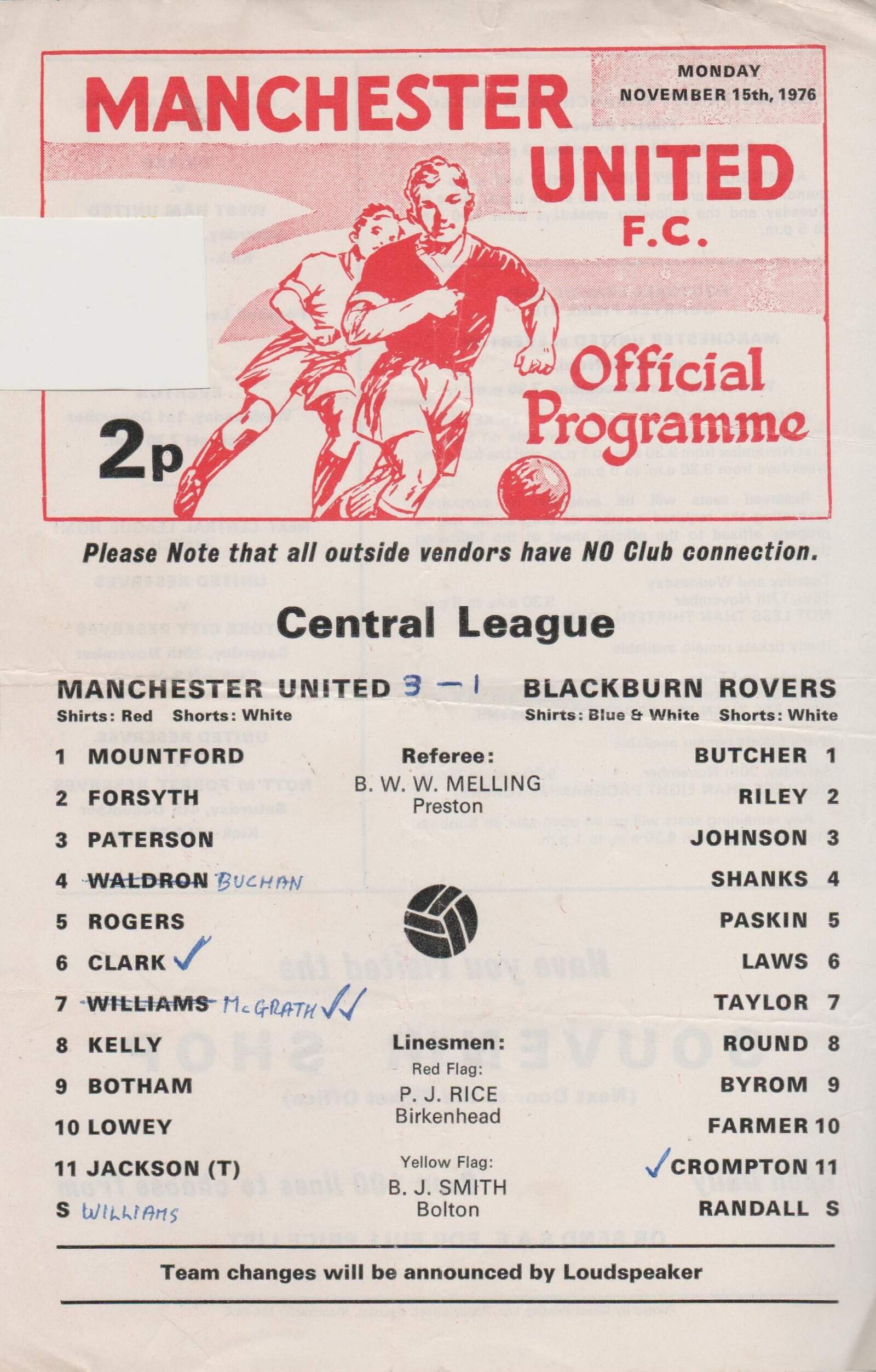 Match: Manchester United Reserves v Blackburn Rovers Reserves Competition: Central League Date: 15-Nov-1976 Comments: Single sheet Rating: 3 Condition: Token missing, team changes, folds Weight in grams: 20