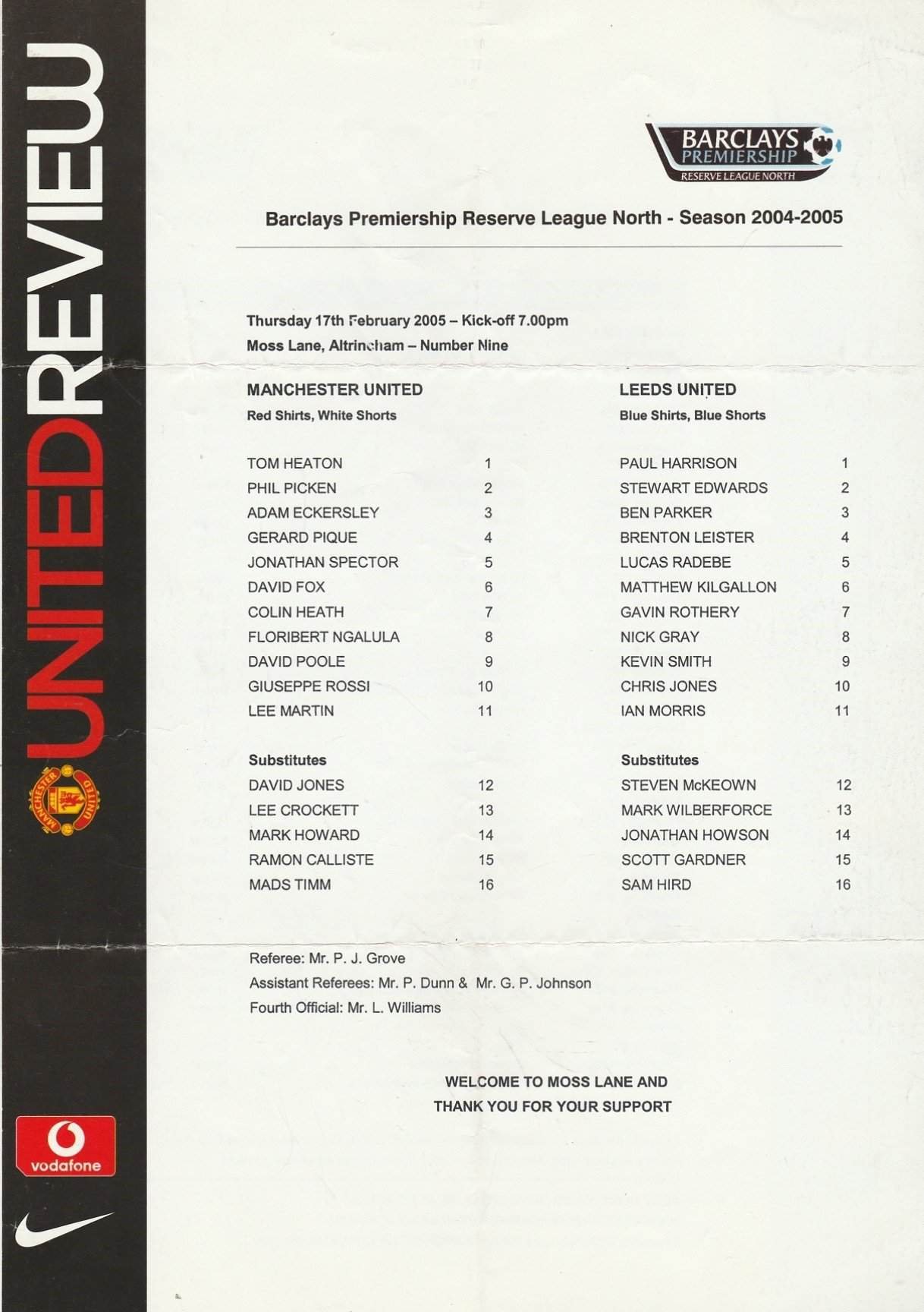 Match: Manchester United Reserves v Leeds United Reserves Competition: Barclays Premiership Reserve League North Date: 17-Feb-2005 Comments: Single sheet Rating: 3 Condition: Folds Weight in grams: 20