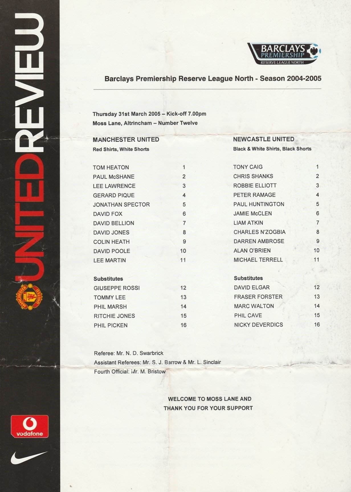 Match: Manchester United Reserves v Newcastle United Reserves Competition: Barclays Premiership Reserve League North Date: 31-Mar-2005 Comments: Single sheet Rating: 3 Condition: Folds Weight in grams: 20