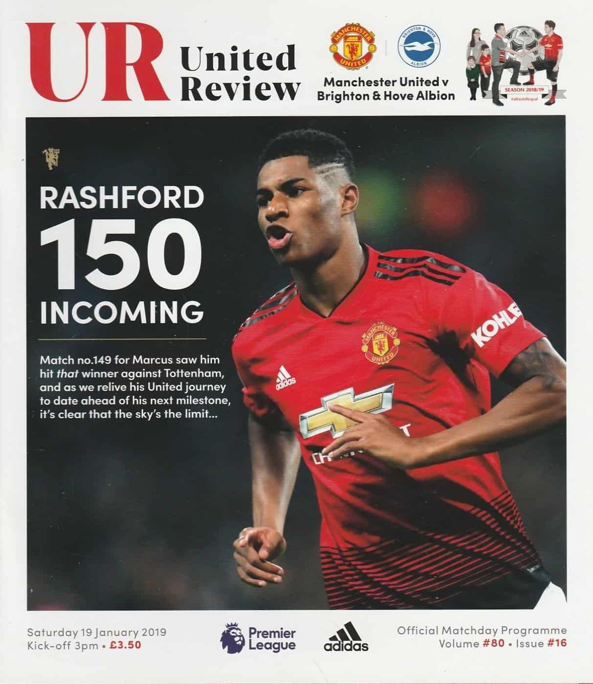 Match: Manchester United v Brighton & Hove Albion Competition: Premier League Date: 19-Jan-2019 Comments: Rating: 3 Condition: Small tear on back page Weight in grams: 300