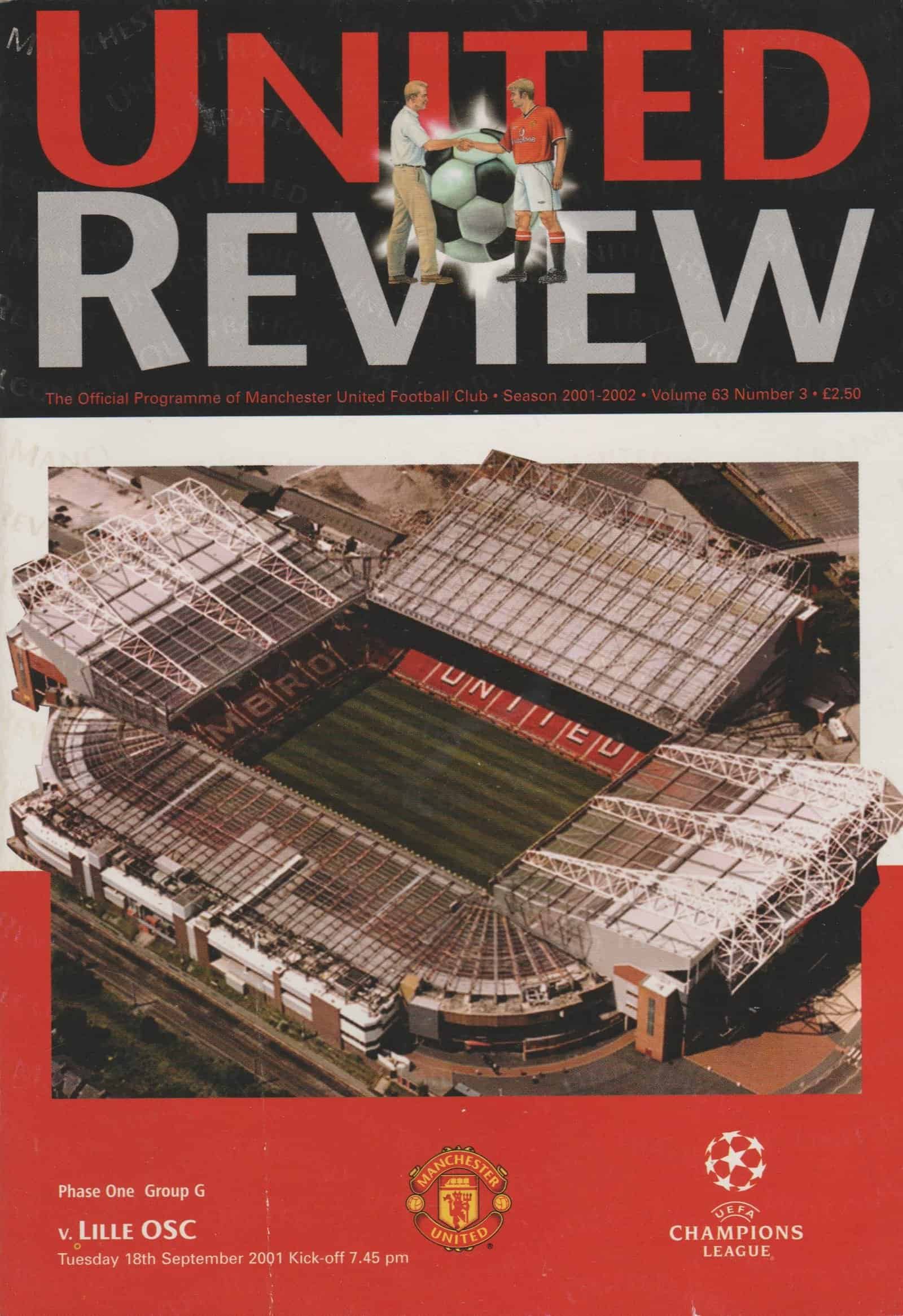 Match: Manchester United v Lille Competition: Champions League Group G Date: 18-Sep-2001 Comments: Rating: 3 Condition: Light fold on cover, crease on corner of back page Weight in grams: 160