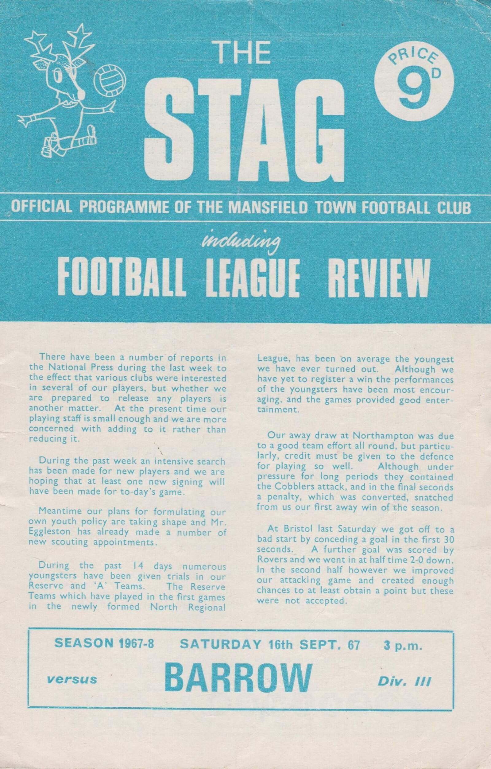 Match: Mansfield Town v Barrow Competition: League Division 3 Date: 16-Sep-1967 Comments: Rating: 3 Condition: Slight folds Weight in grams: 60