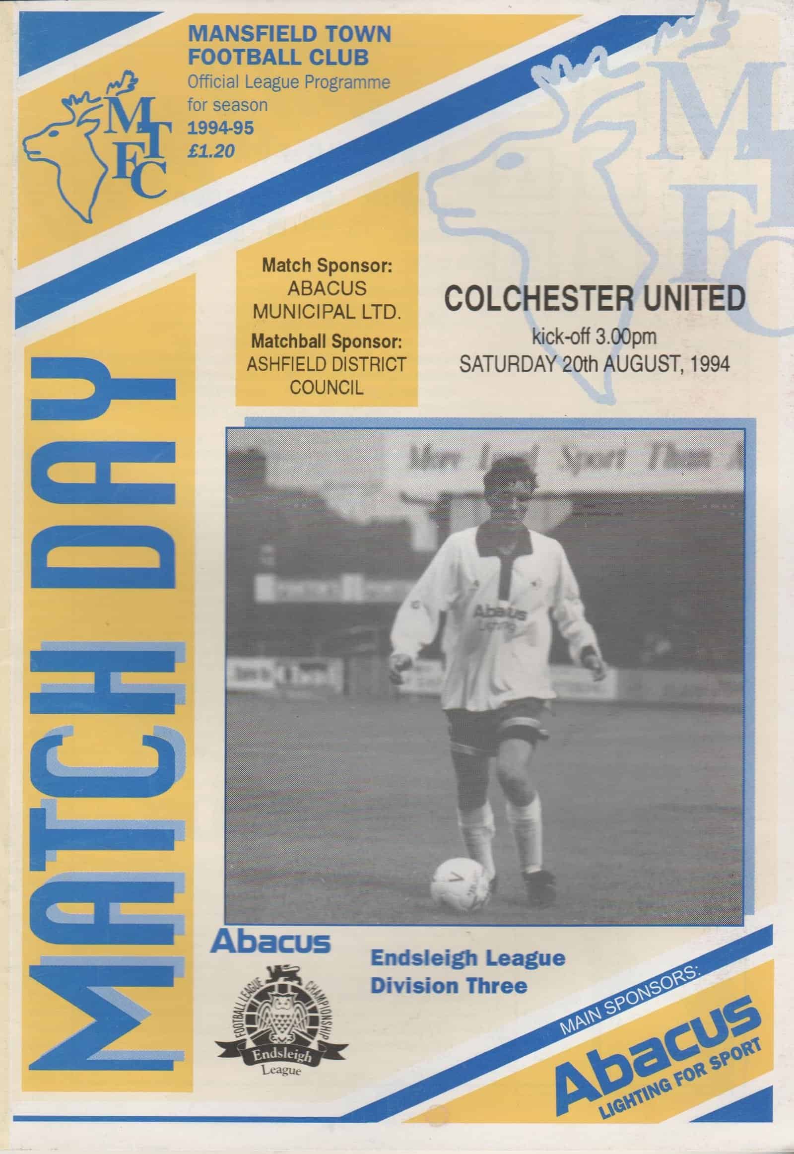 Match: Mansfield Town v Colchester United Competition: League Division 3 Date: 20-Aug-1994 Comments: Rating: 4 Condition: Very good Weight in grams: 80