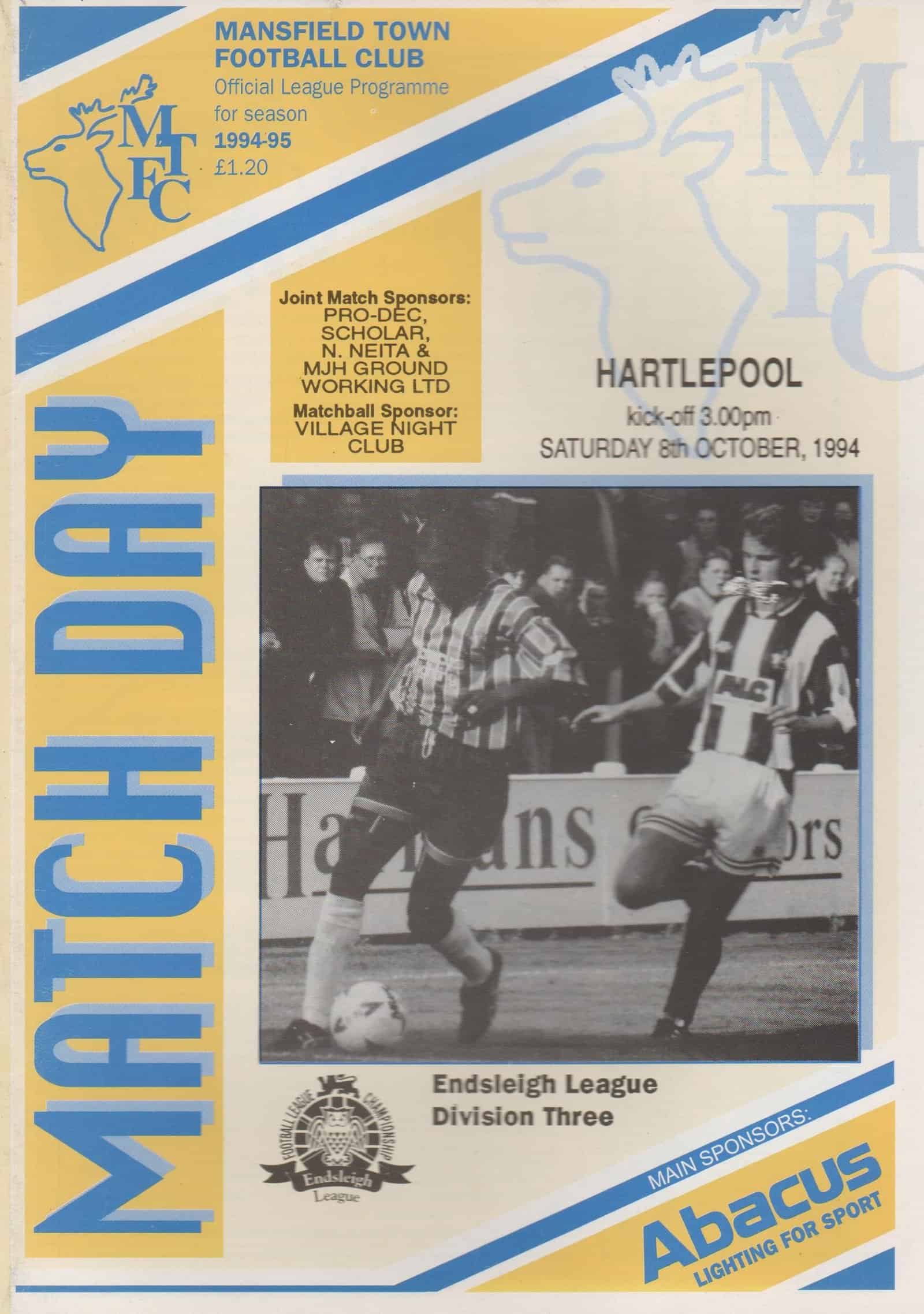 Match: Mansfield Town v Hartlepool United Competition: League Division 3 Date: 08-Oct-1994 Comments: Rating: 4 Condition: Very good Weight in grams: 60