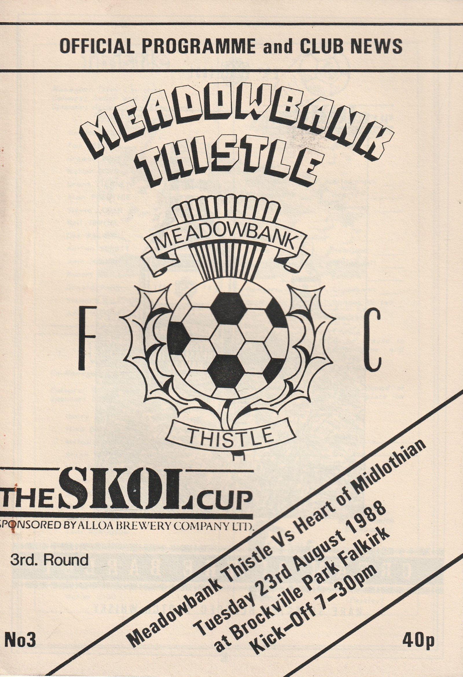 Match: Meadowbank Thistle v Heart of Midlothian Competition: Skol Cup 3rd Round Date: 23-Aug-1988 Comments: Rating: 4 Condition: Very good Weight in grams: 60