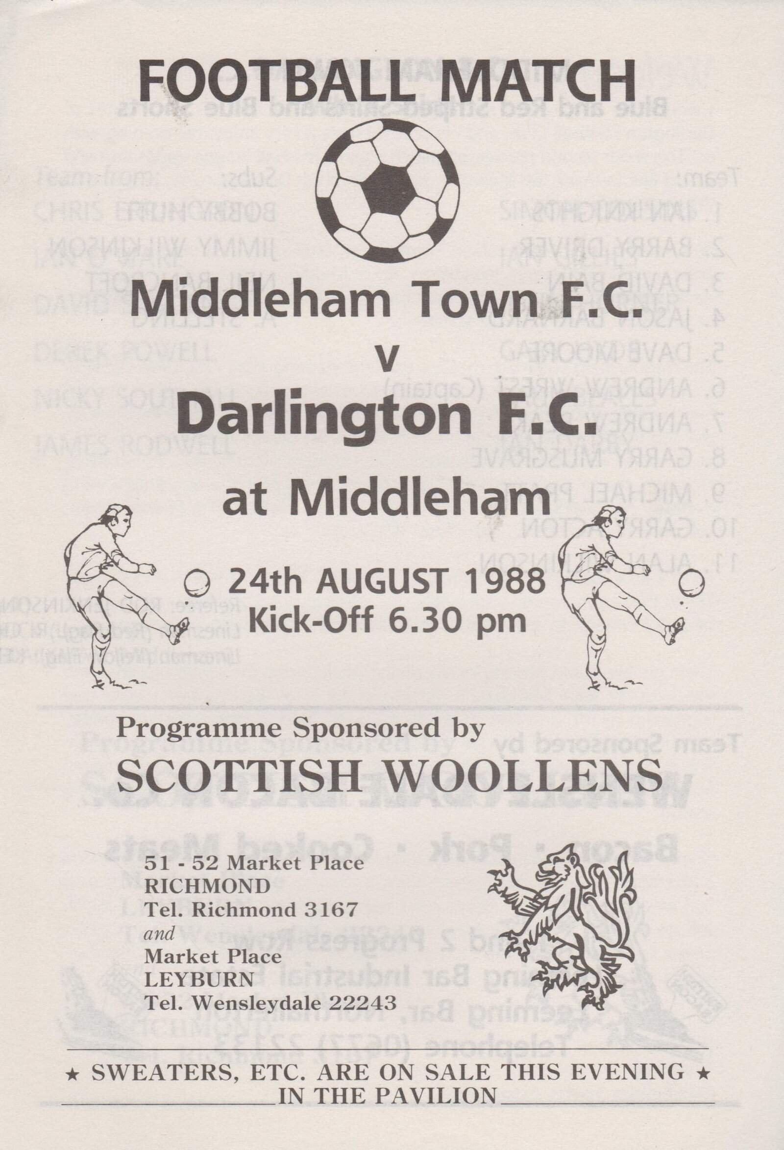 Match: Middleham Town v Darlington Competition: Friendly Date: 24-Aug-1988 Comments: 4 page issue Rating: 4 Condition: Very Good Weight in grams: 40