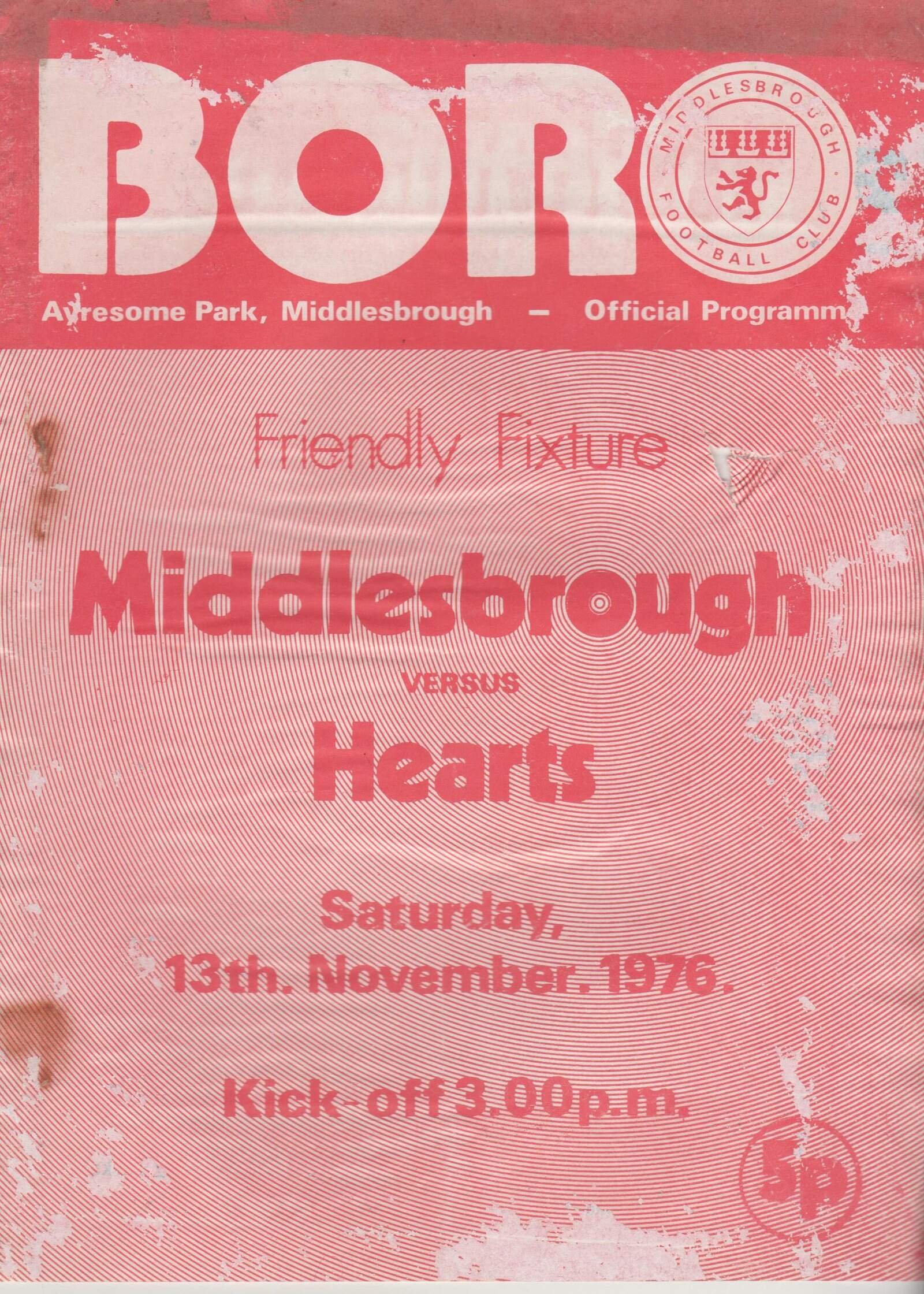 Match: Middlesbrough v Heart of Midlothian Competition: Friendly Date: 13-Nov-1976 Comments: 4 page issue Rating: 2 Condition: Poor Weight in grams: 40