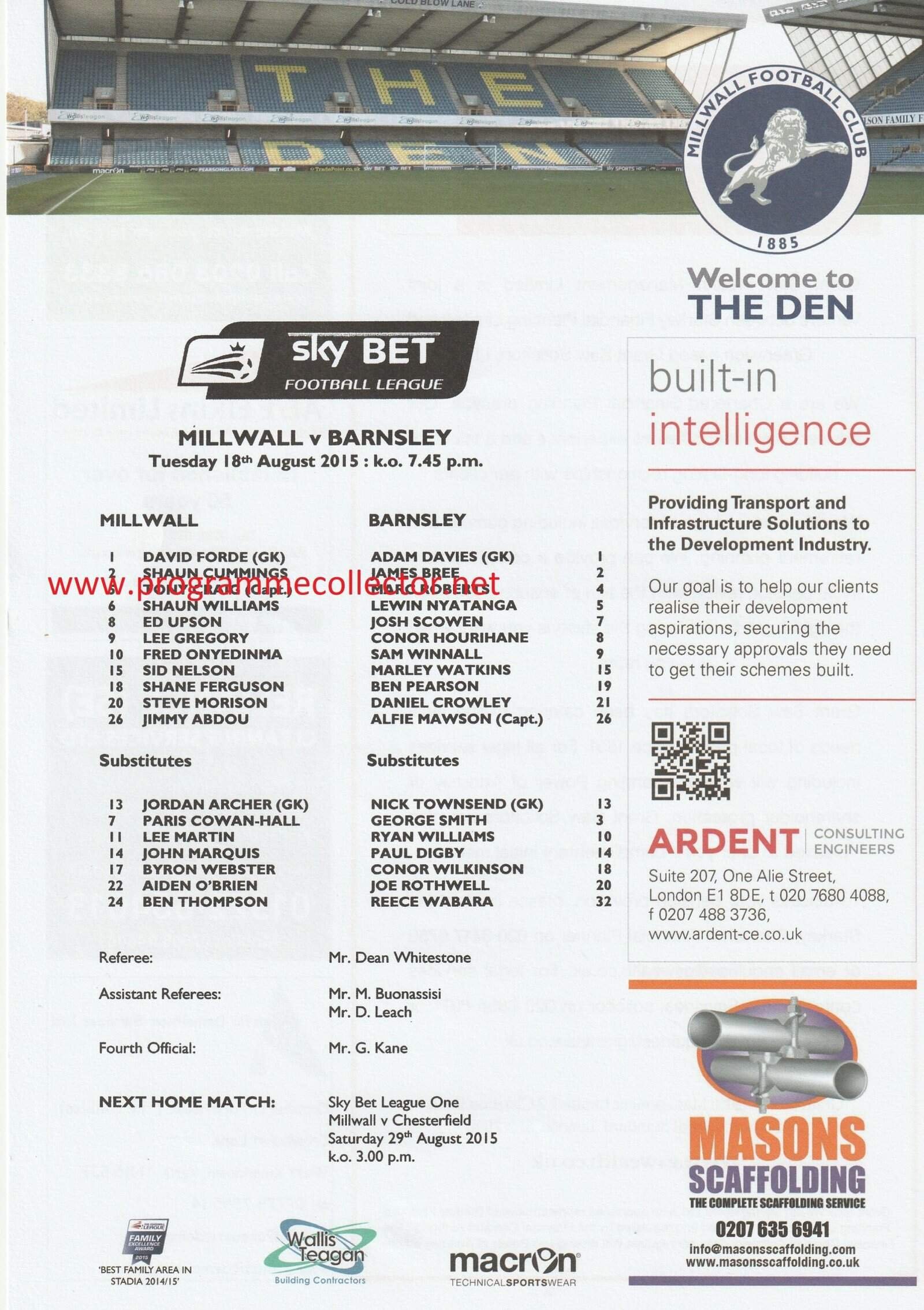 Match: Millwall v Barnsley Competition: League 1 Date: 18-Aug-2015 Comments: Rating: 4 Condition: Very good Weight in grams: 20