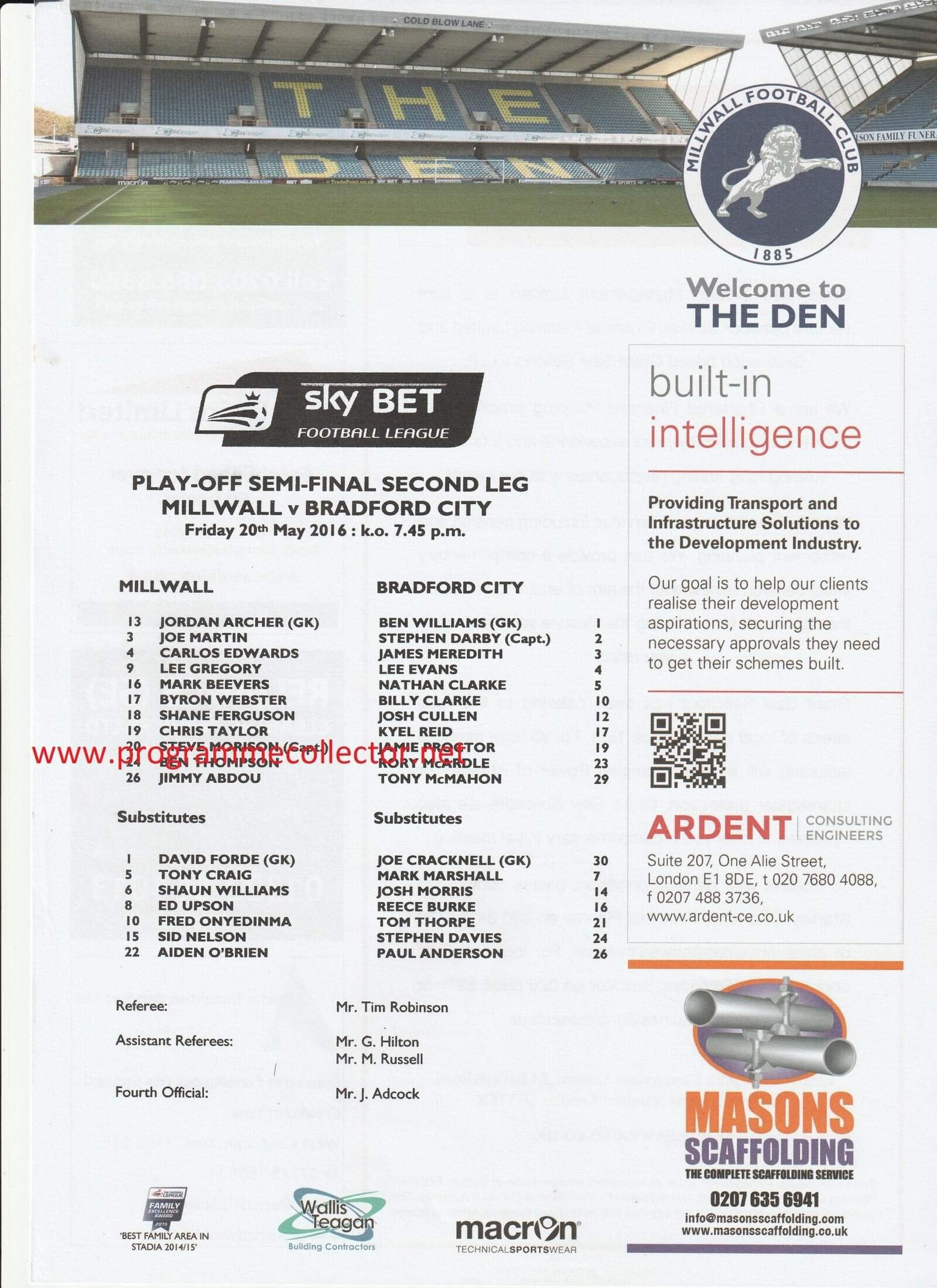 Match: Millwall v Bradford City Competition: League 1 Play off Semi Final Date: 20-May-2016 Comments: Rating: 4 Condition: Very good Weight in grams: 20