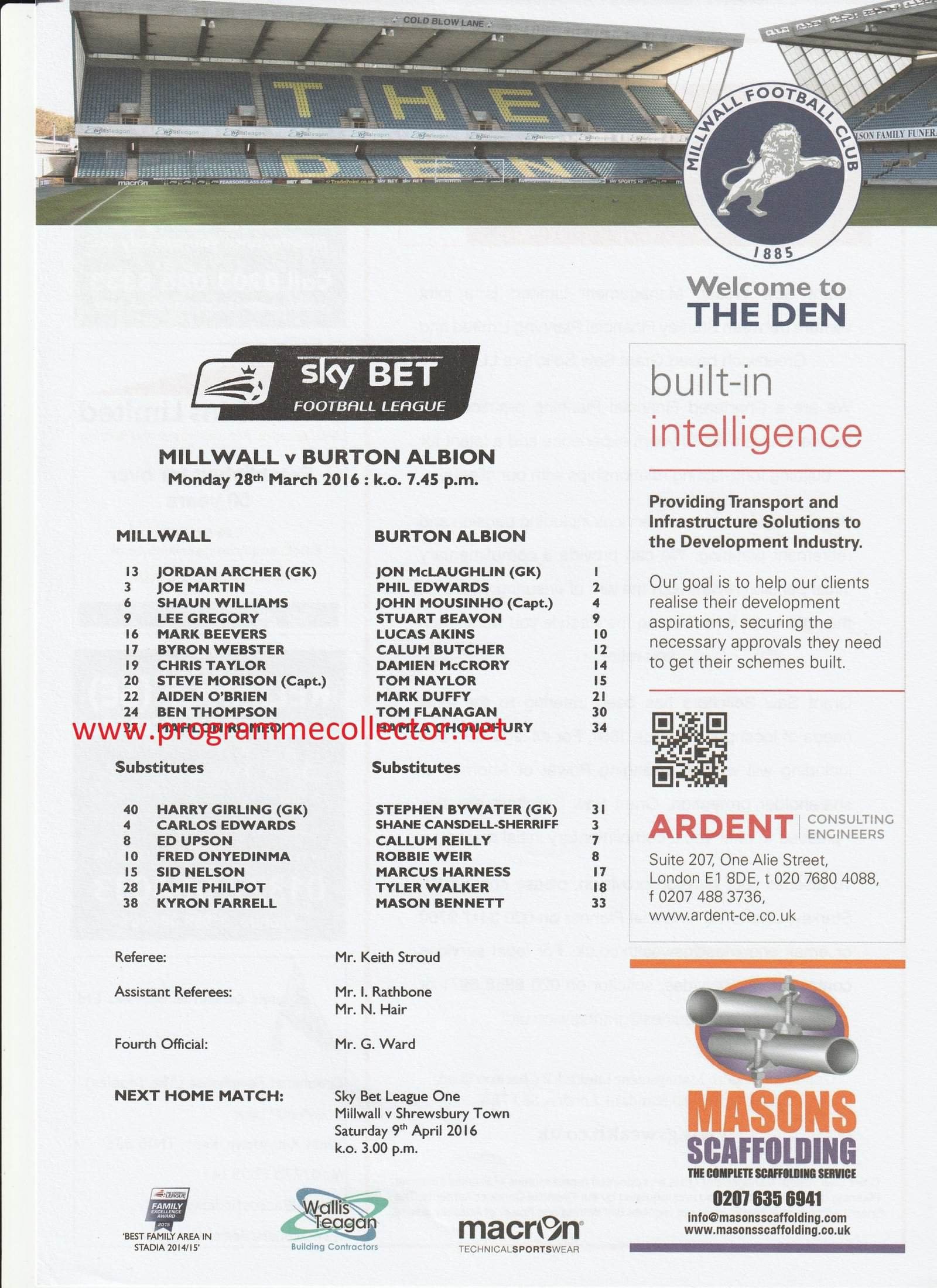 Match: Millwall v Burton Albion Competition: League 1 Date: 28-Mar-2016 Comments: Rating: 4 Condition: Very good Weight in grams: 20