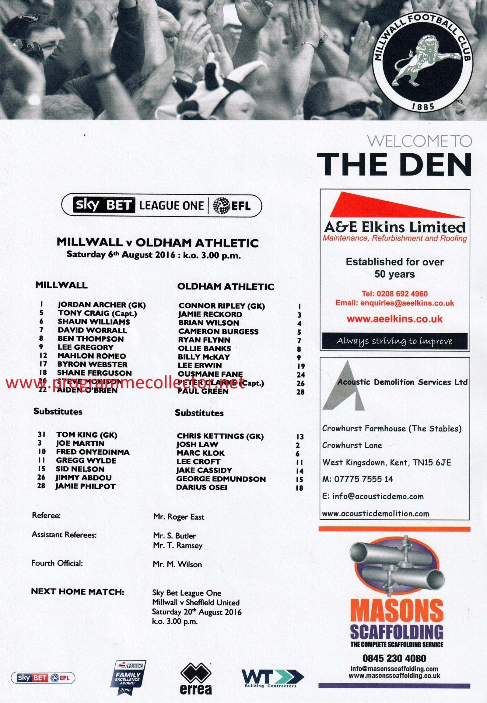Match: Millwall v Oldham Athletic Competition: League 1 Date: 06-Aug-2016 Comments: Rating: 4 Condition: Very good Weight in grams: 20