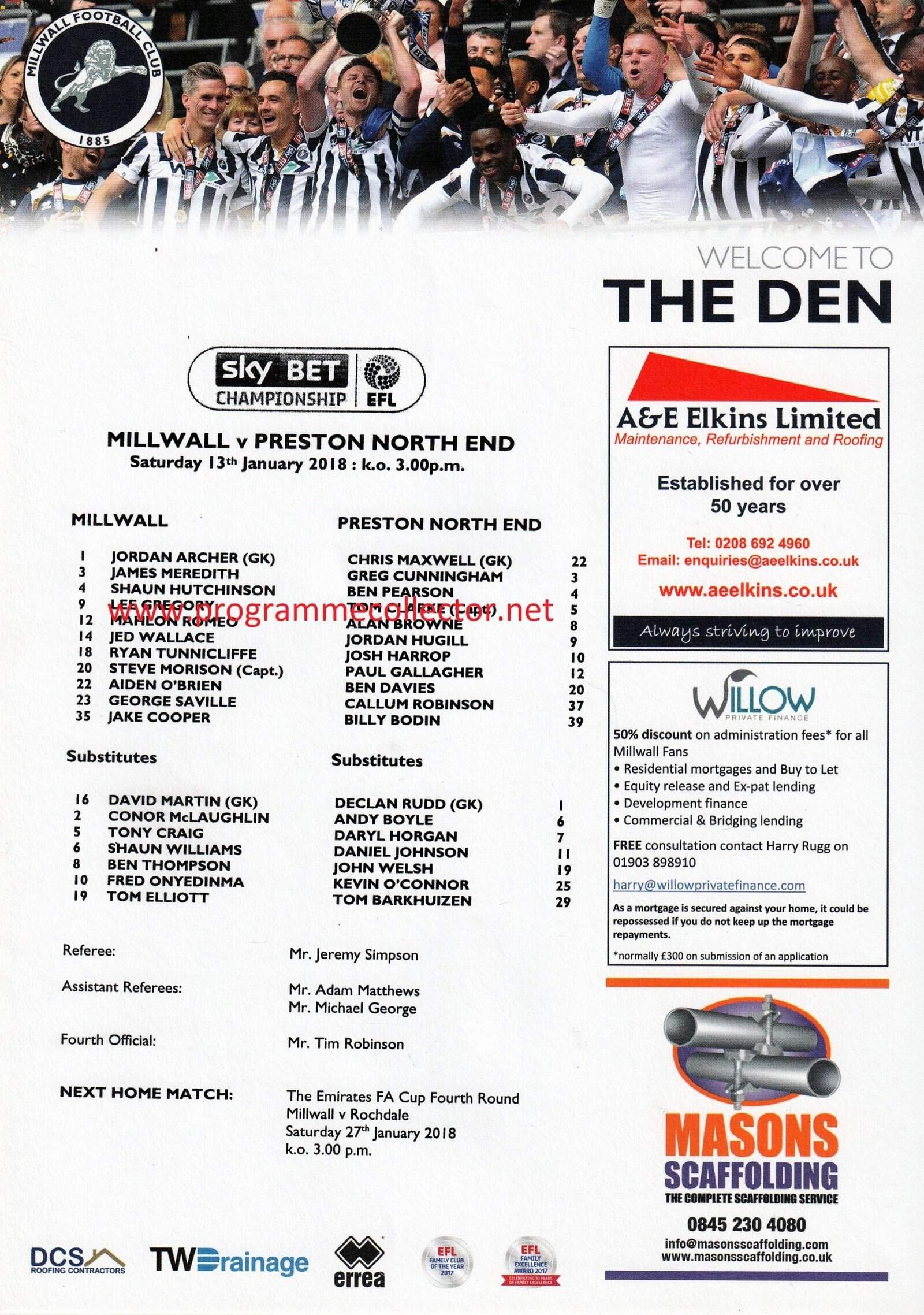 Match: Millwall v Preston North End Competition: League Championship Date: 13-Jan-2018 Comments: Rating: 4 Condition: Very good Weight in grams: 20