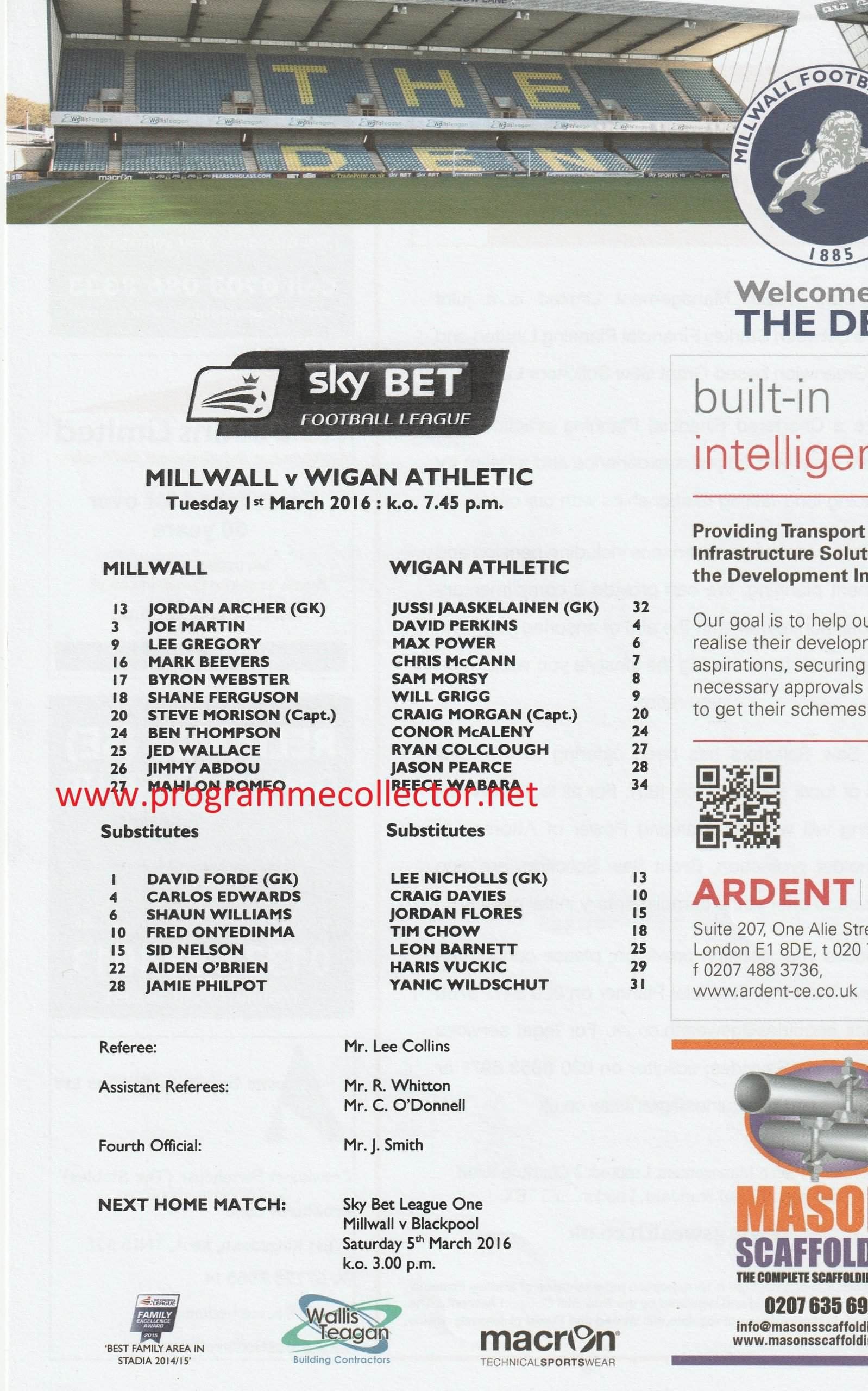 Match: Millwall v Wigan Athletic Competition: League 1 Date: 01-Mar-2016 Comments: Rating: 4 Condition: Very good Weight in grams: 20