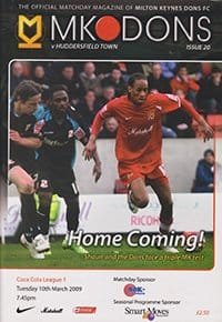 Match: Milton Keynes Dons v Huddersfield Town Competition: League 1 Date: 10-03-2009 Comments: Centre fold poster missing Rating: 2 Condition: Very good Weight in grams: 160
