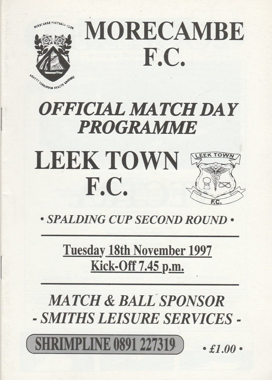 Match: Morecambe v Leek Town Competition: Spalding Cup 2nd Round Date: 18-Nov-1997 Comments: Rating: 4 Condition: Very good Weight in grams: 40