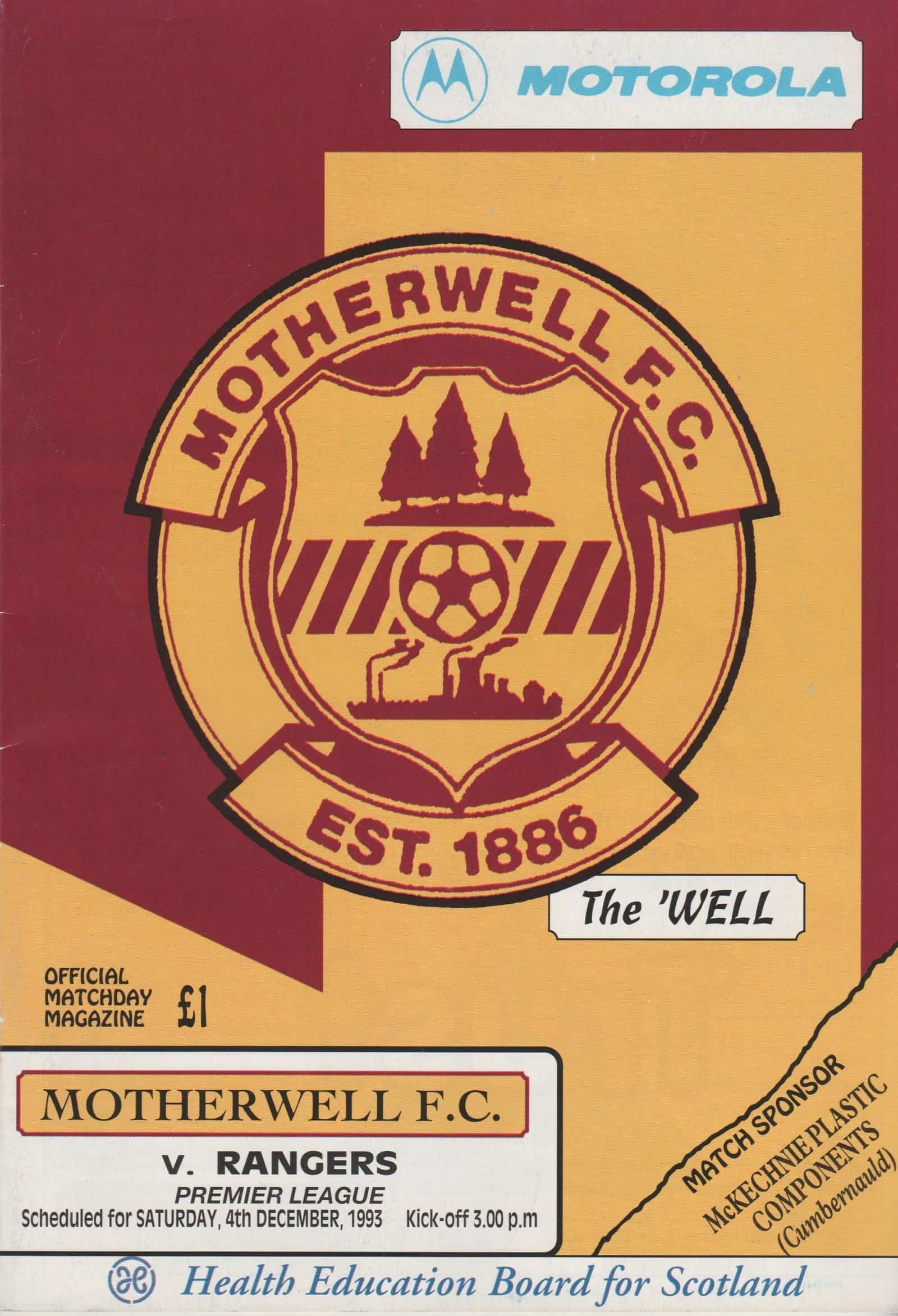 Match: Motherwell v Glasgow Rangers Competition: Scottish Premier League Date: 04-Dec-1993 Comments: Rating: 4 Condition: Very good Weight in grams: 140