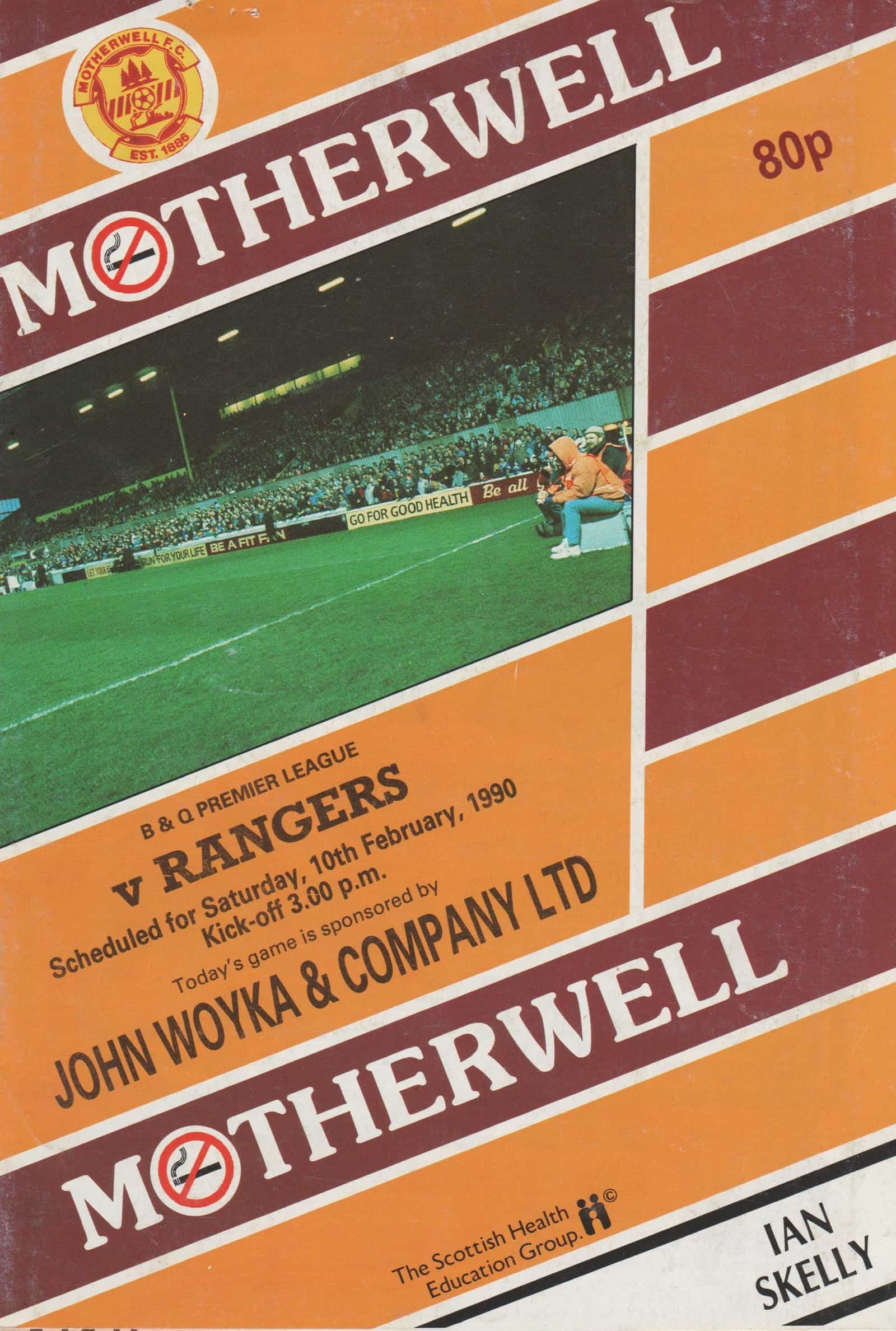 Match: Motherwell v Glasgow Rangers Competition: Scottish Premier League Date: 10-Feb-1990 Comments: Rating: 3 Condition: Small pin holes on face, includes press cuttings Weight in grams: 140