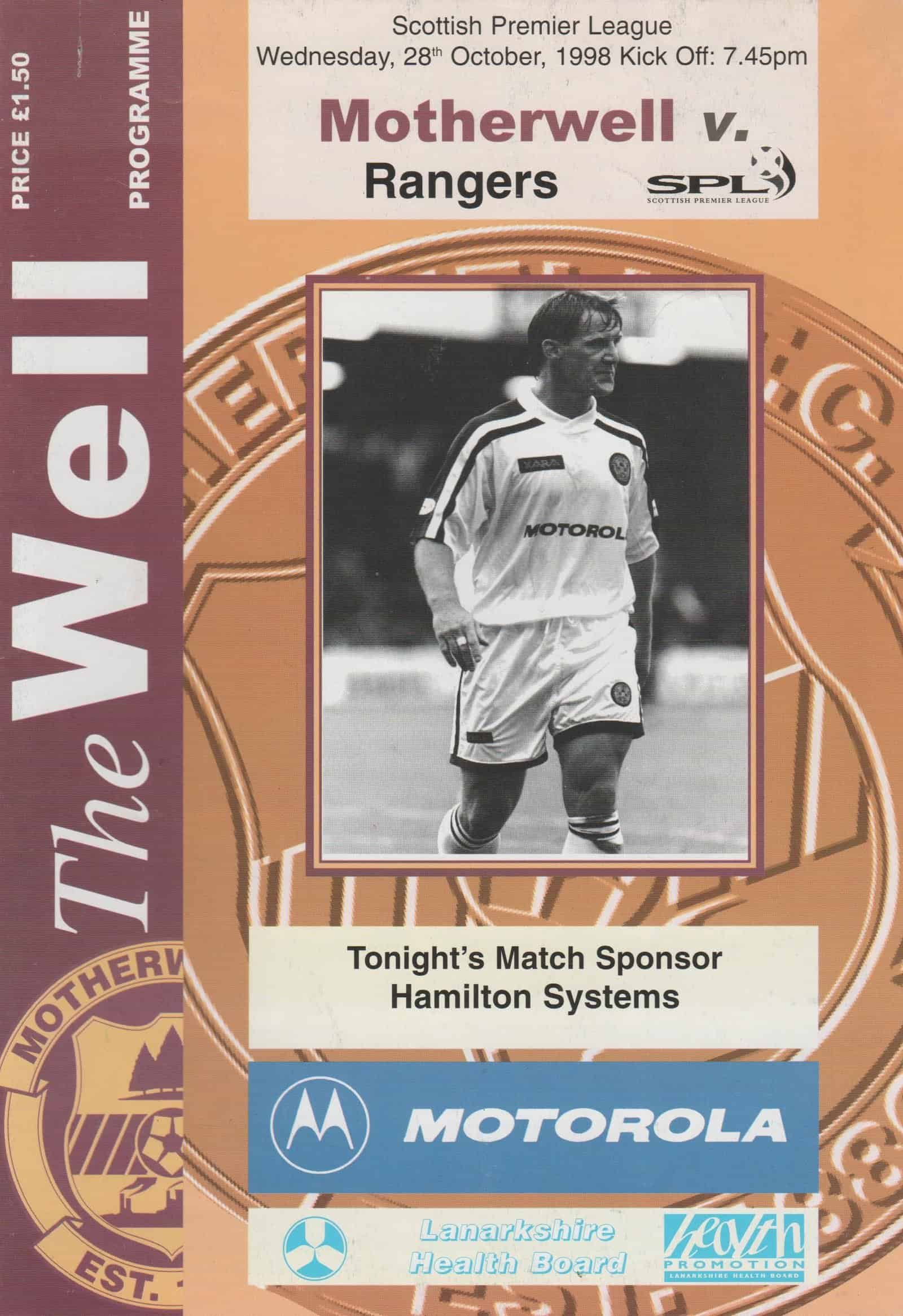 Match: Motherwell v Glasgow Rangers Competition: Scottish Premier League Date: 28-Oct-1998 Comments: Rating: 4 Condition: Slight mark on edge of back page Weight in grams: 140