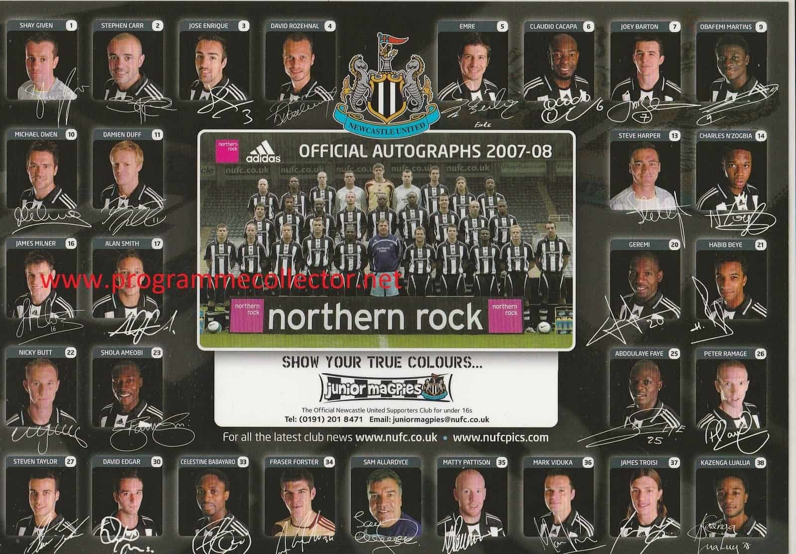 Player: Newcastle United 2007-08 autographed sheet Club : Newcastle United Date: 2007-08 Comments: Laminated coloured pre printed photograph/autograph sheet Size: 30cm x 20cm Rating: 4 Condition: Very good Weight in grams: 60