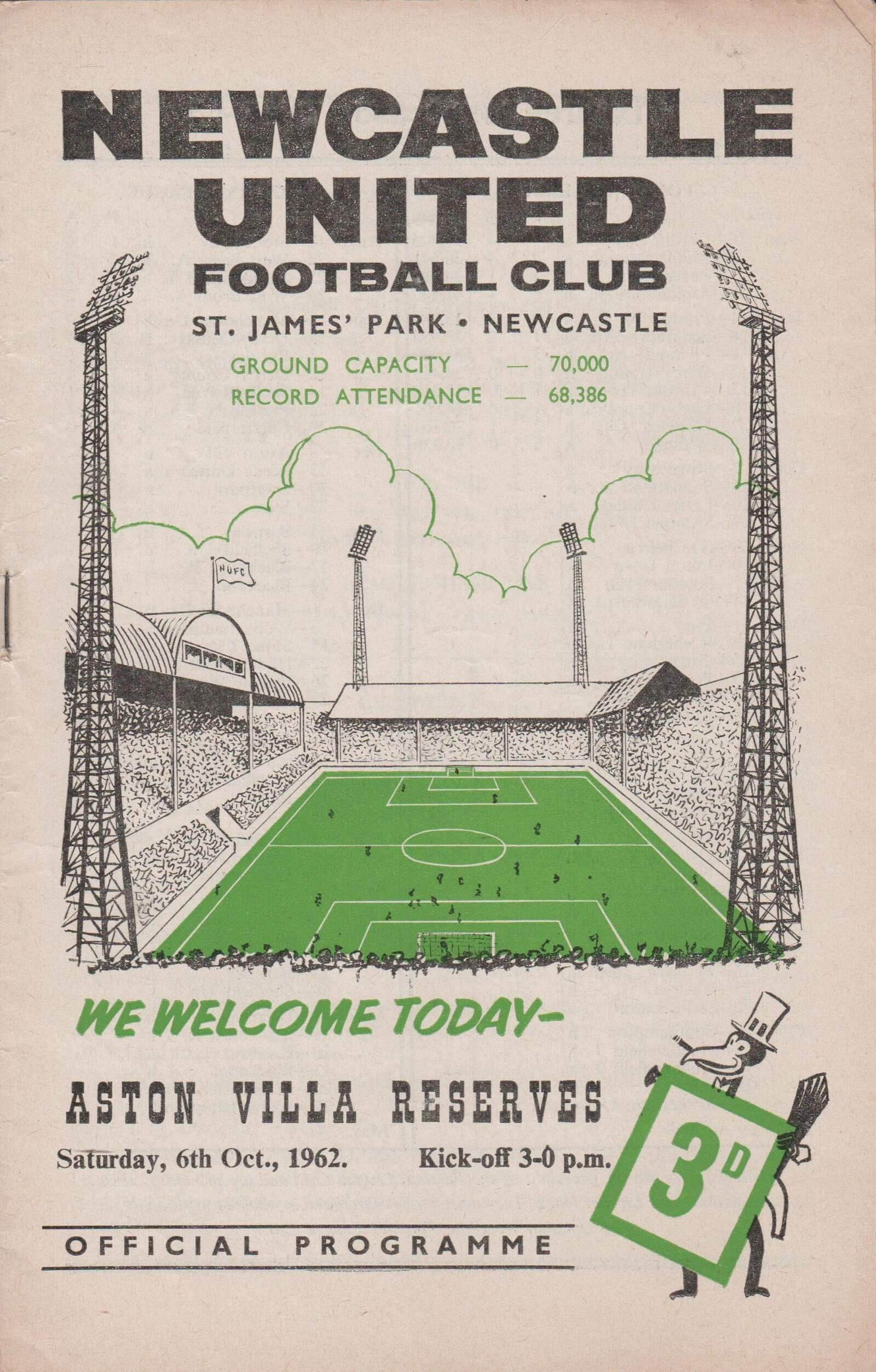 Match: Newcastle United Reserves v Aston Villa Reserves Competition: Central League Date: 06-10-1962 Comments: Rating: 3 Condition: Half time scores listed inside, team changes in pencil Weight in grams: 60