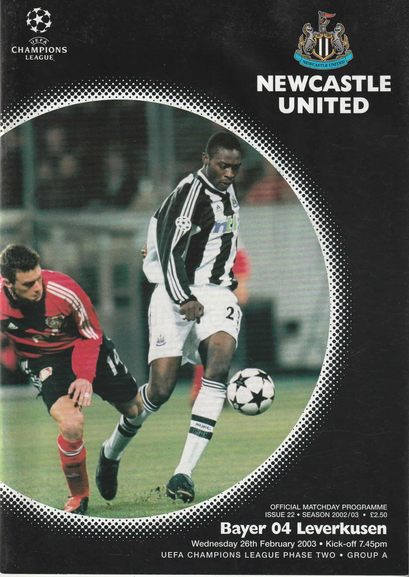 Match: Newcastle United v Bayer 04 Leverkusen Competition: Champions League Group A Date: 26-Feb-2003 Comments: Rating: 4 Condition: Faint fold on corner of back page Weight in grams: 200