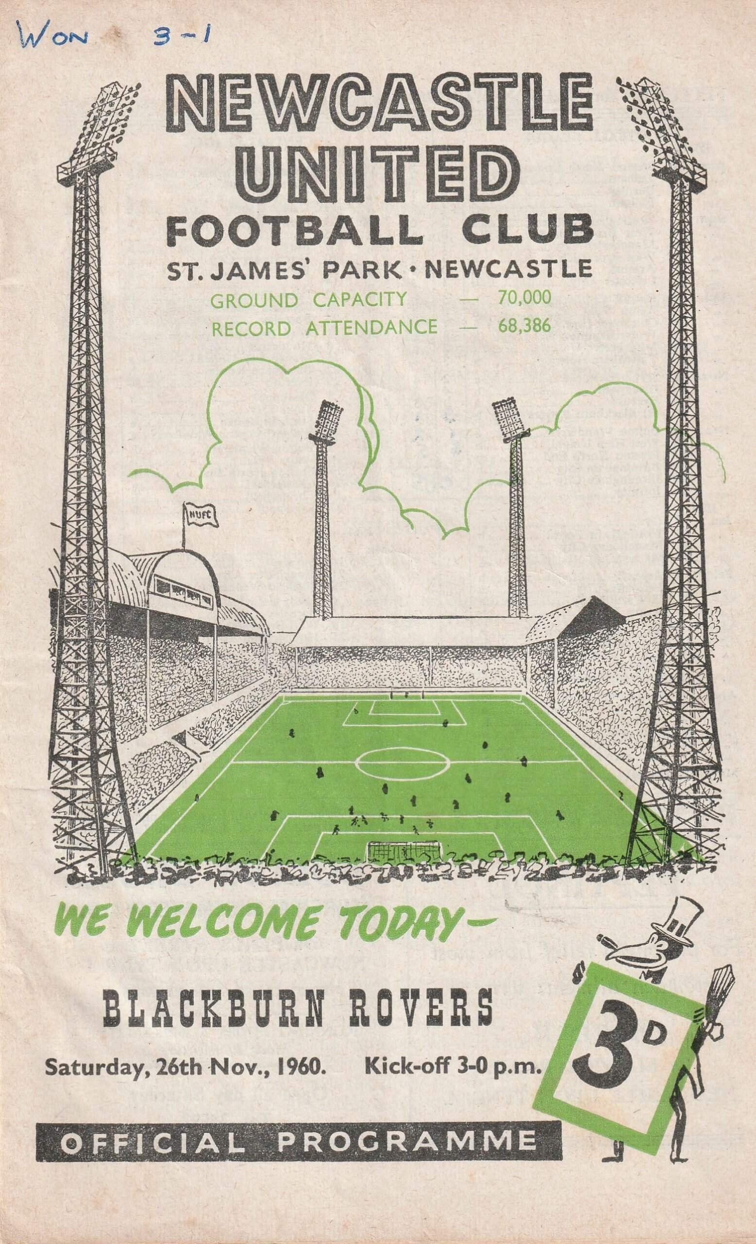 Match: Newcastle United v Blackburn Rovers Competition: League Division 1 Date: 26-Nov-1960 Comments: Rating: 3 Condition: Score on face, attendance written inside Weight in grams: 60