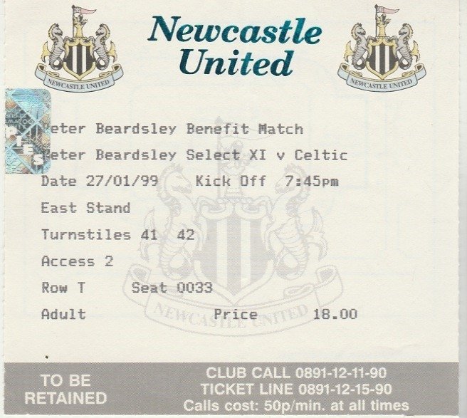 Match: Newcastle United v Glasgow Celtic Competition: Peter Beardsley Benefit Match Date: 27-Jan-1999 Comments: Rating: 4 Condition: Fold Weight in grams: 20