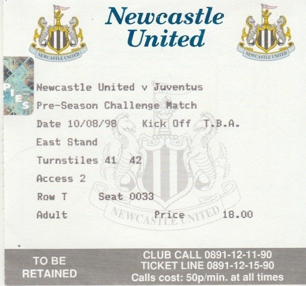 Match: Newcastle United v Juventus Competition: Friendly Date: 10-Aug-1998 Comments: Rating: 4 Condition: Very good Weight in grams: 20