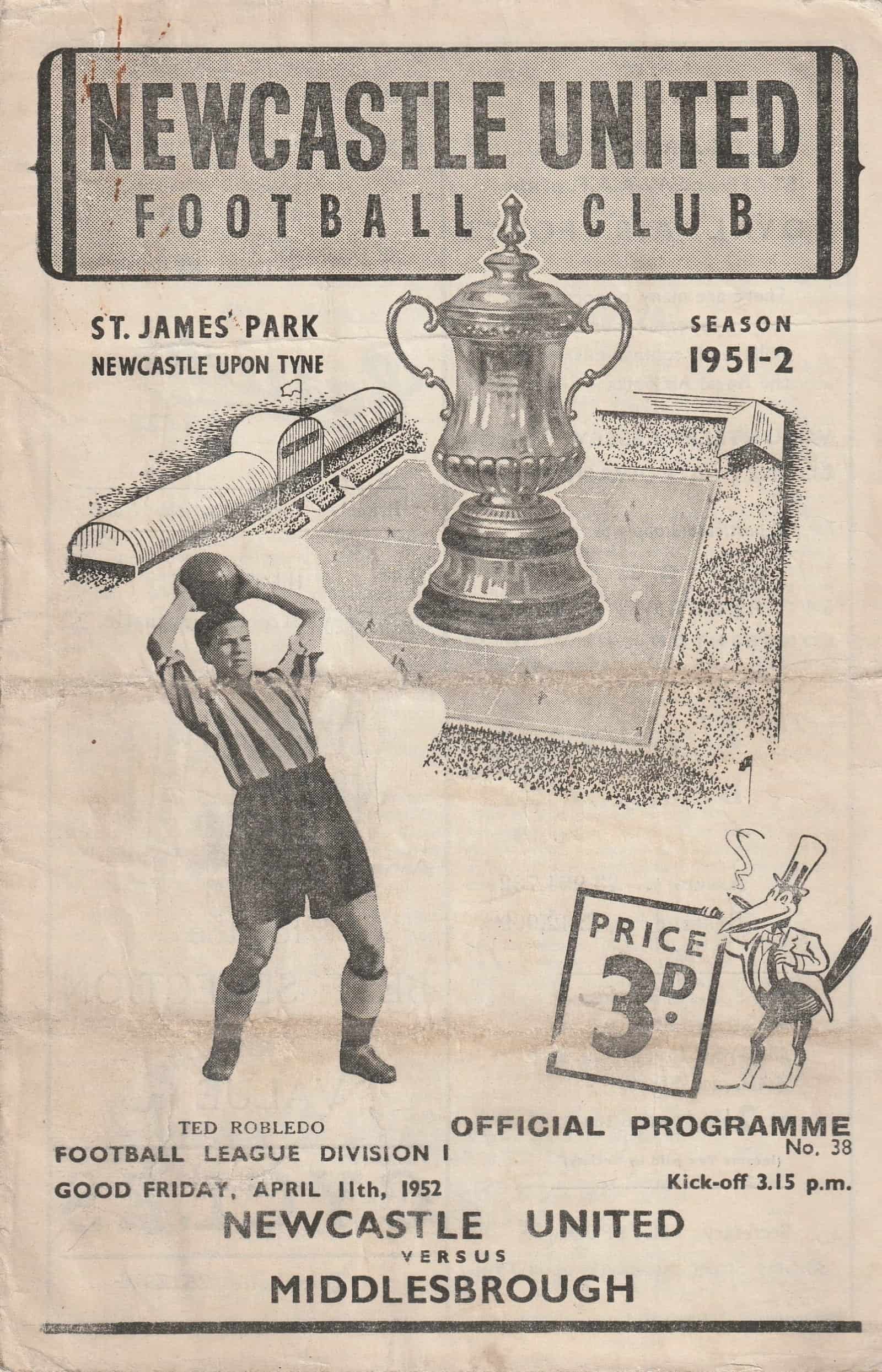 Match: Newcastle United v Middlesbrough Competition: League Division 1 Date: 11-Apr-1952 Comments: Rating: 3 Condition: Fold, soiling marks on cover, wear and nick to edge of pages Weight in grams: 60