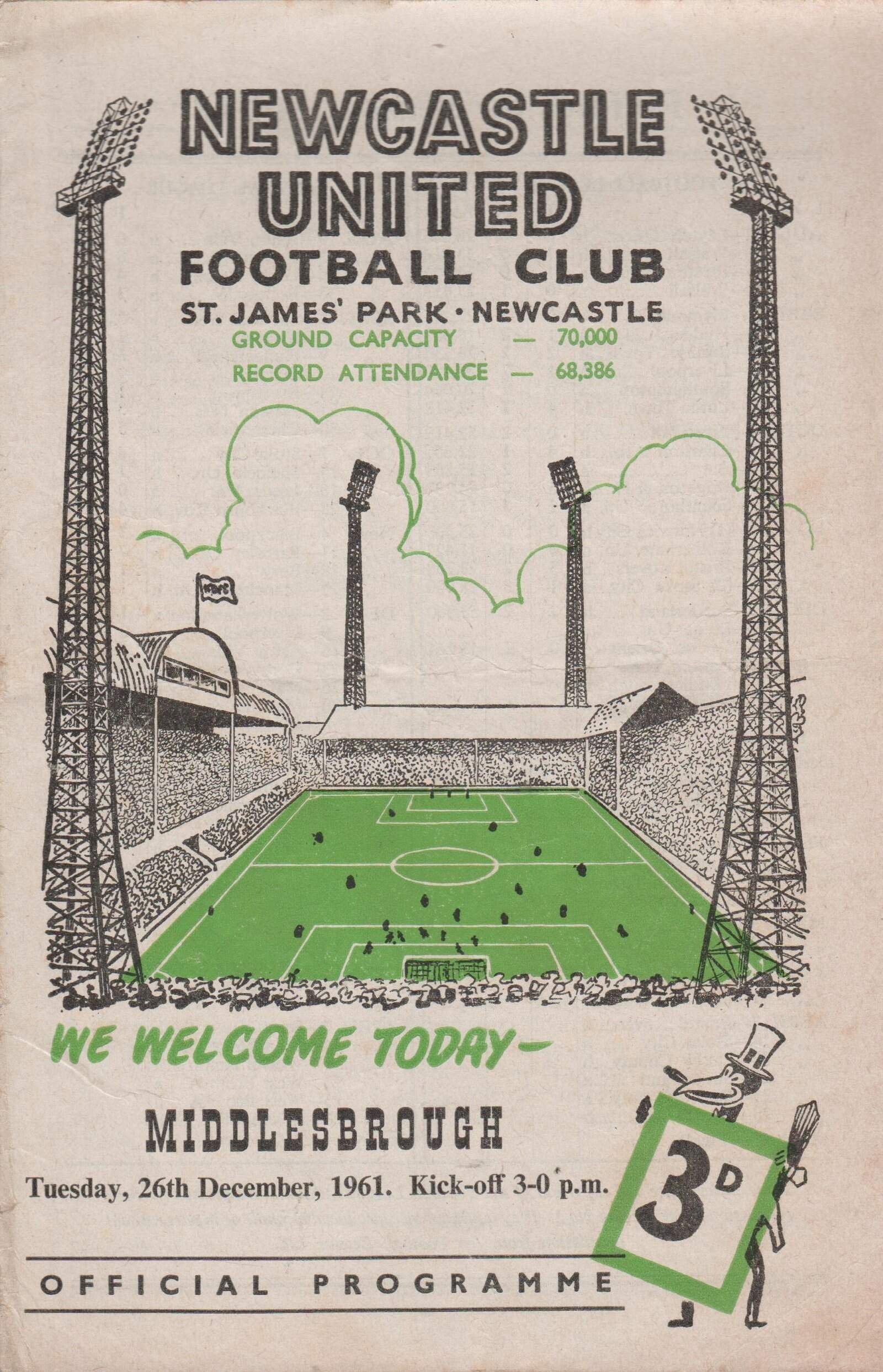 Match: Newcastle United v Middlesbrough Competition: League Division 2 Date: 26-12-1961 Comments: Rating: 3 Condition: Fold, small tear on spine, marks on back Weight in grams: 40