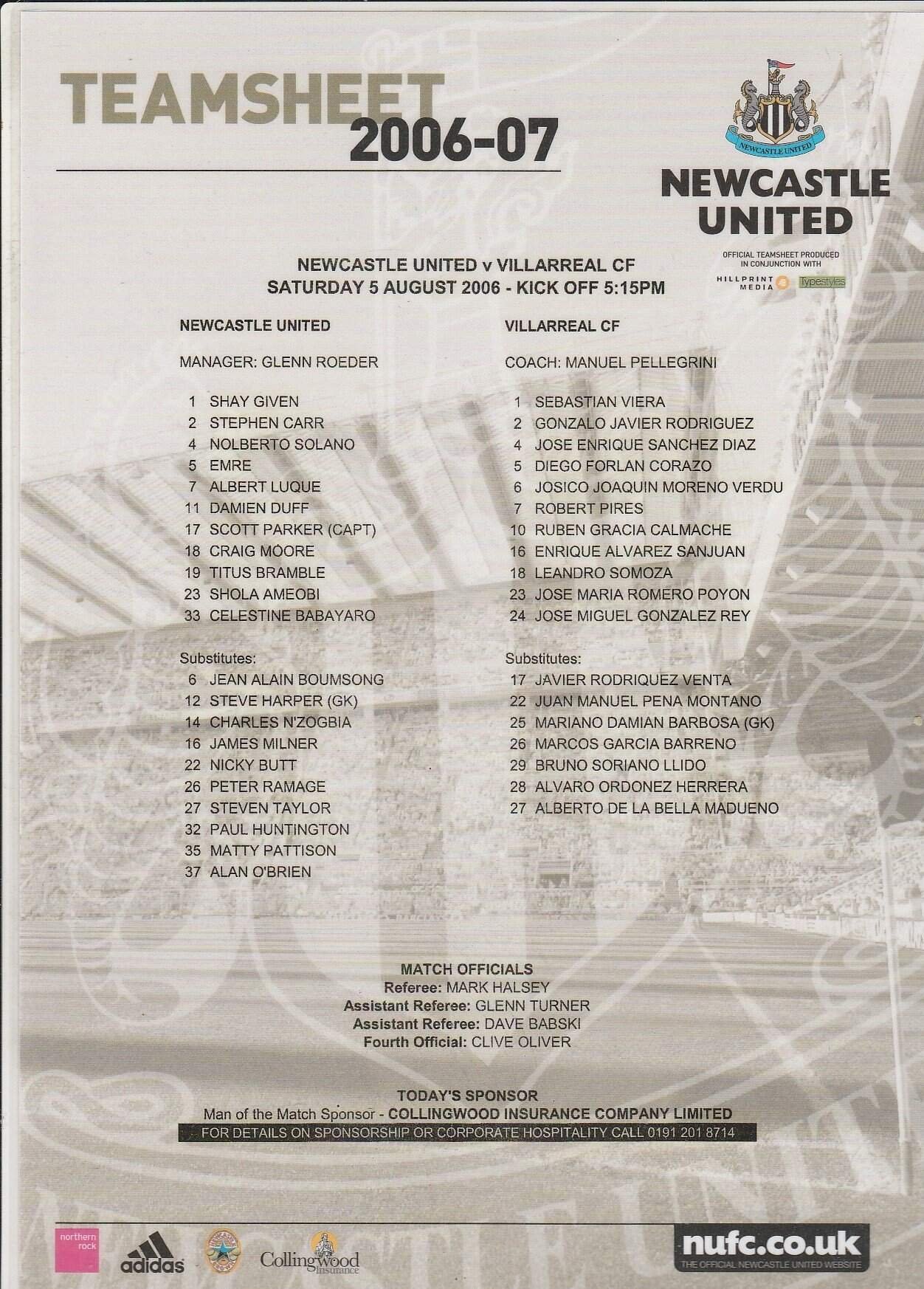 Match: Newcastle United v Villarreal Competition: Friendly Date: 05-Aug-2006 Comments: Laminated team sheet Rating: 4 Condition: Very good Weight in grams: 20