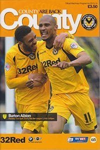 Match: Newport County v Burton Albion Competition: League 2 Date: 21-04-2014 Comments: 1st season back in league Rating: 5 Condition: Excellent Weight in grams: 260