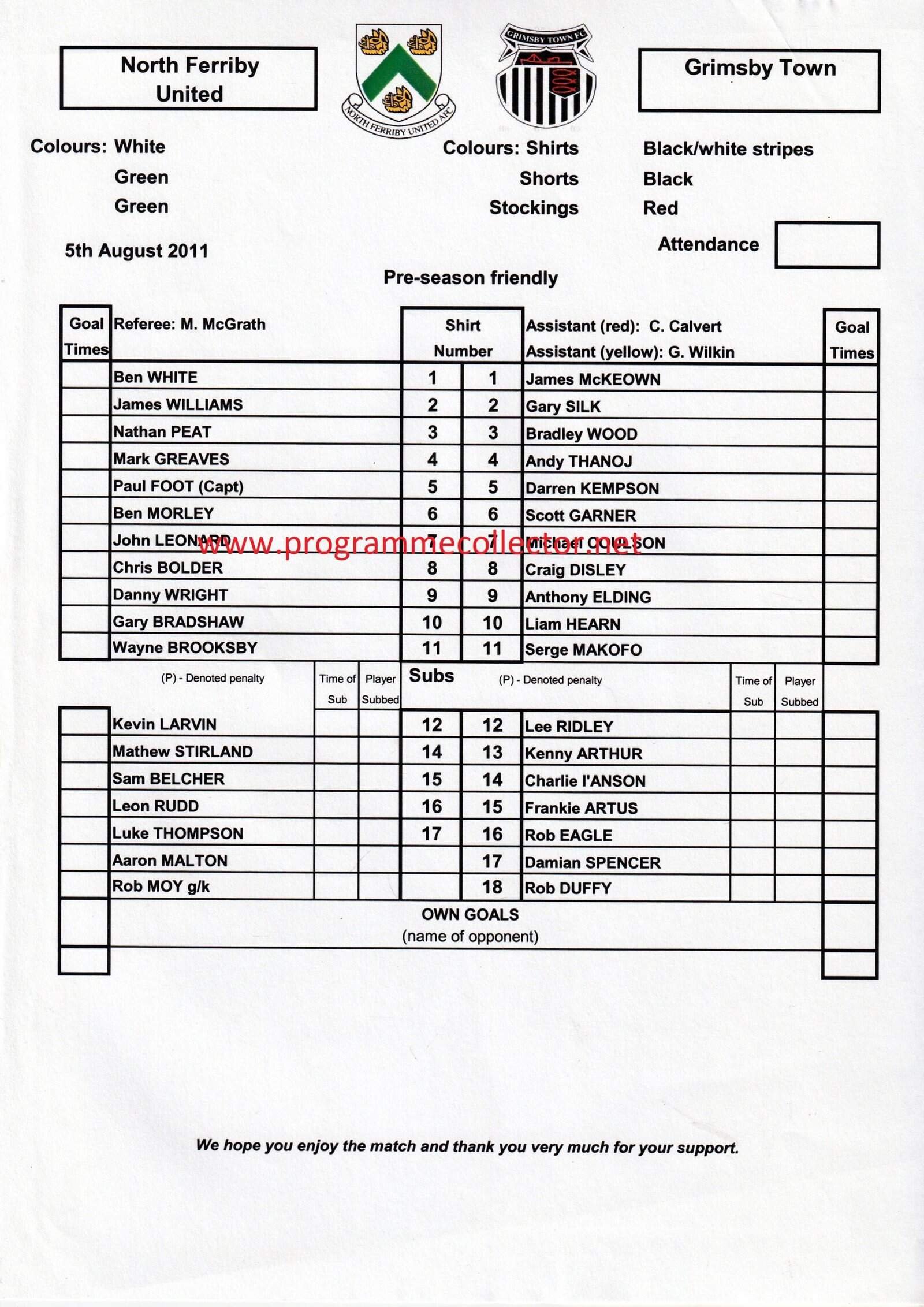 Match: North Ferriby United v Grimsby Town Competition: Friendly Date: 05-Aug-2011 Comments: Single sheet issue Rating: 4 Condition: Very good Weight in grams: 20